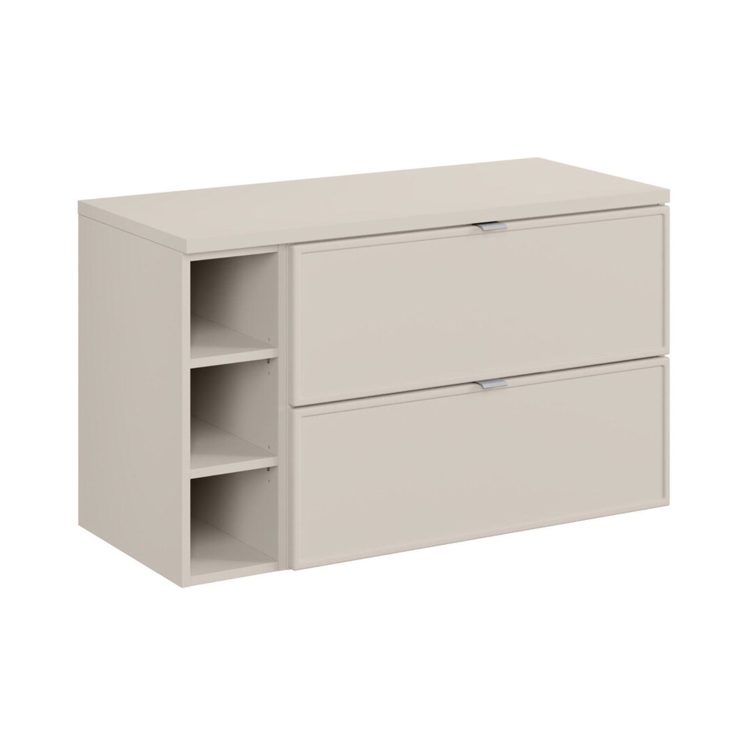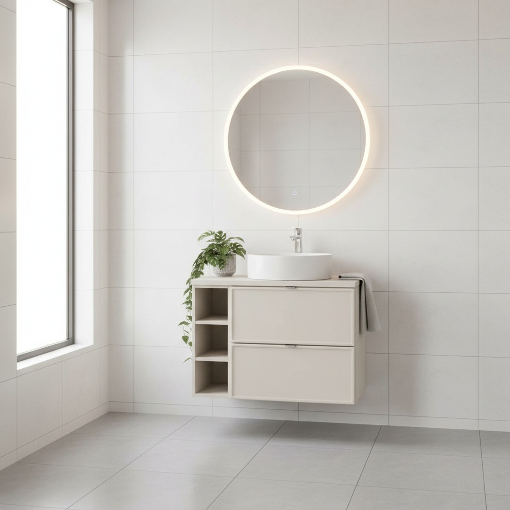 Compact et fonctionnel, cet ensemble est idéal pour optimiser les espaces tout en conservant une belle capacité de rangement. Les tiroirs coulissants permettent d’organiser facilement vos produits du quotidien, tandis que les niches visibles apportent une touche décorative pratique pour paniers ou accessoires. Son coloris cachemire mat offre une atmosphère douce et raffinée, facile à intégrer dans une salle de bain moderne.