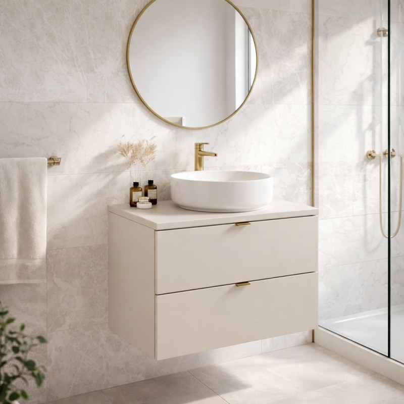Compact et parfaitement adapté aux petites salles de bain, ce meuble sous vasque offre un rangement optimisé grâce à ses tiroirs coulissants. Son plan pour vasque permet l’installation d’une vasque à poser selon vos envies, tout en conservant une ligne épurée. Son coloris cachemire mat apporte douceur et modernité, s’intégrant facilement dans un univers contemporain ou minimaliste.