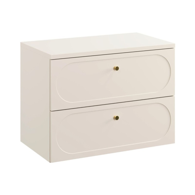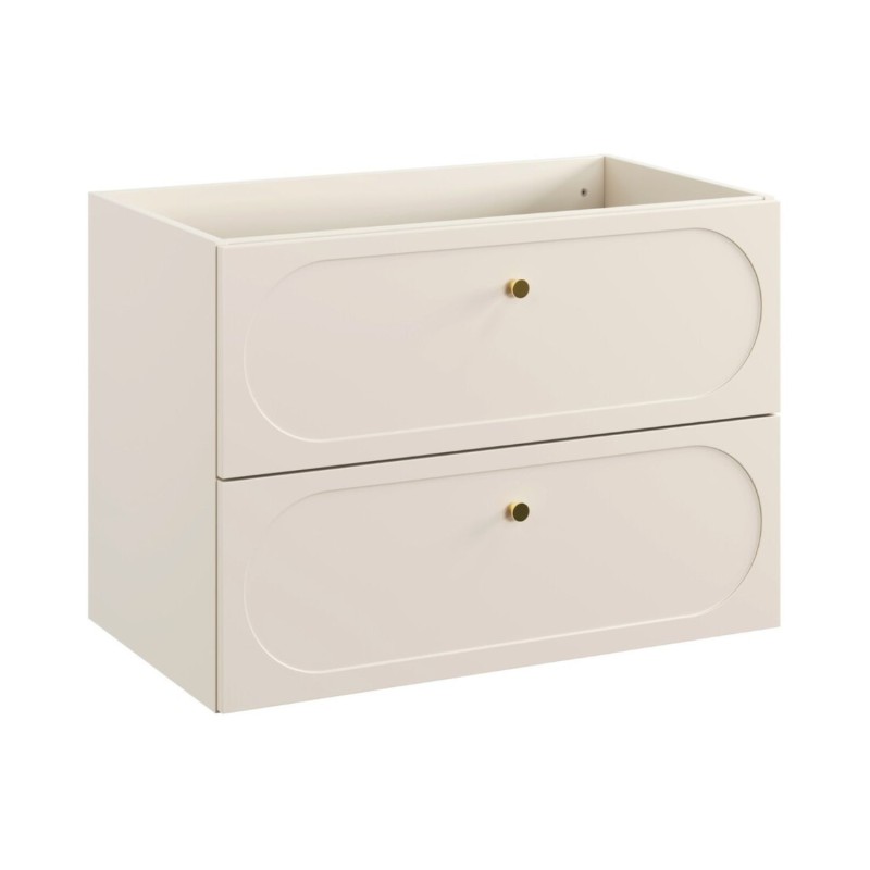 Les façades sont décorées d’un encadrement ovale légèrement creusé, signature élégante de la collection, mises en valeur par des poignées aux finitions dorées. Les deux tiroirs coulissants permettent une organisation simple et efficace. Le plan pour vasque coordonné vous laisse la liberté de choisir la vasque qui correspond parfaitement à votre projet.