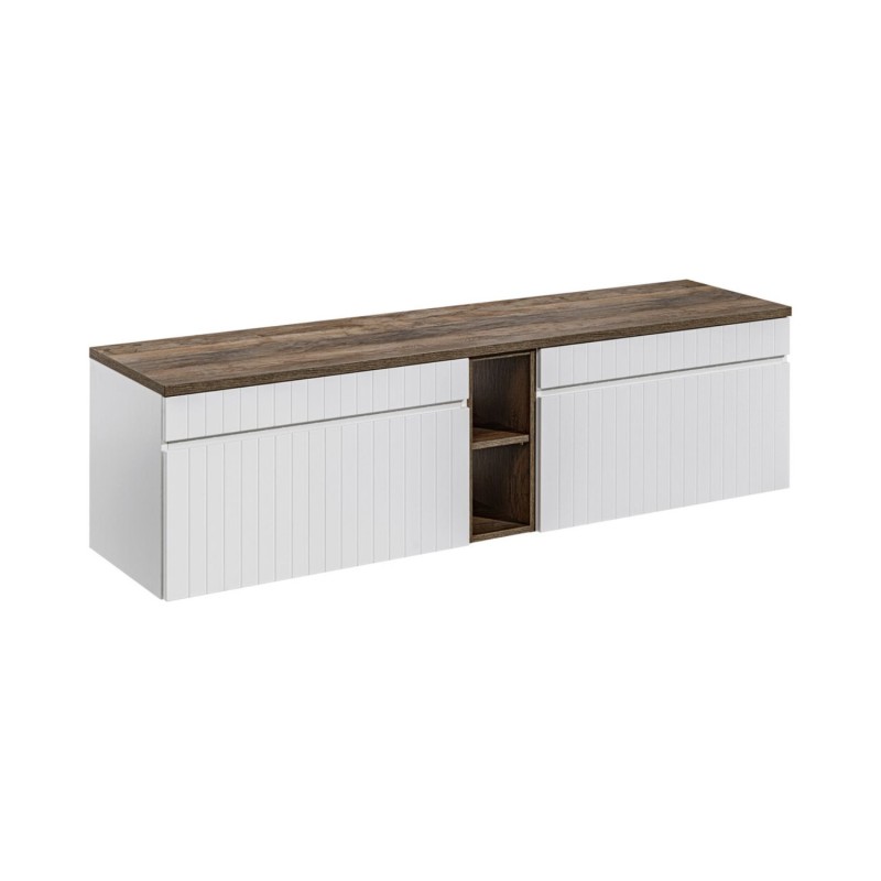 Ensemble ICON blanc : meubles sous vasque 180cm avec niches visibles + plan pour vasque aspect bois foncé