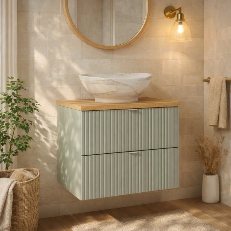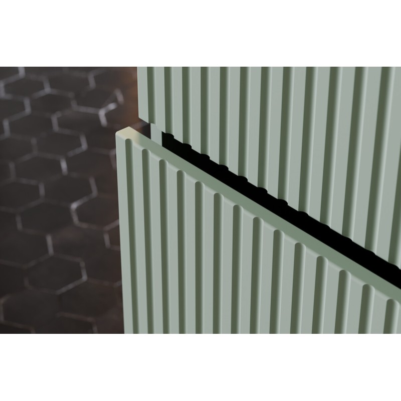 Les façades du meuble présentent un motif rainuré verticalement qui apporte du relief et renforce l’identité design de la collection. Le coloris vert sauge gris, à la fois doux et moderne, s’intègre facilement dans différents styles de décoration.