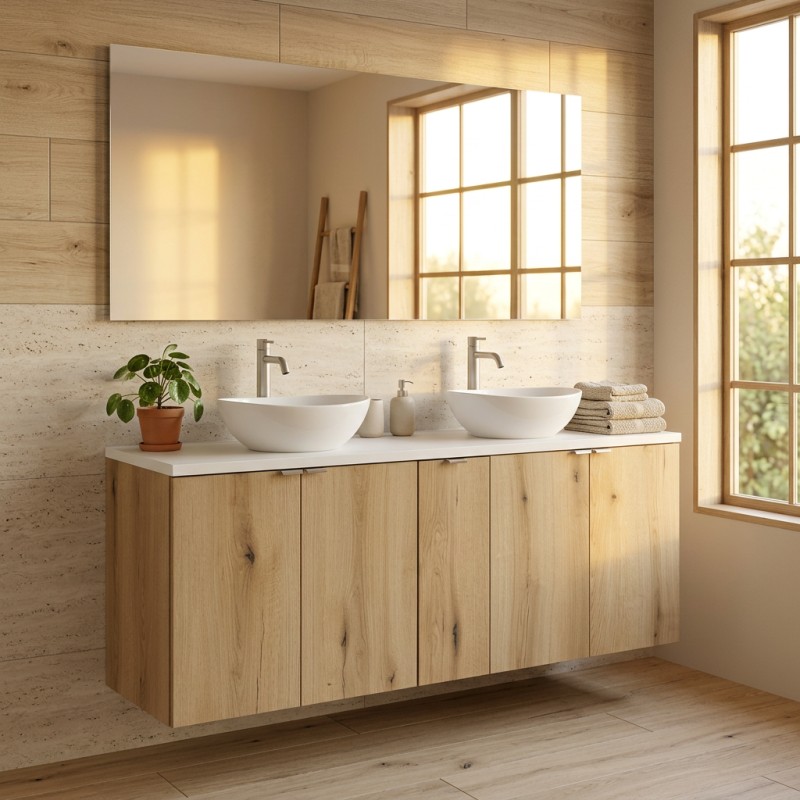Les meubles sous vasque suspendus 2 portes ainsi que le meuble central 1 porte sont proposés en aspect chêne foncé, apportant une ambiance chaleureuse et naturelle à votre salle de bain. Ce coloris bois profond renforce le caractère du meuble tout en restant intemporel.