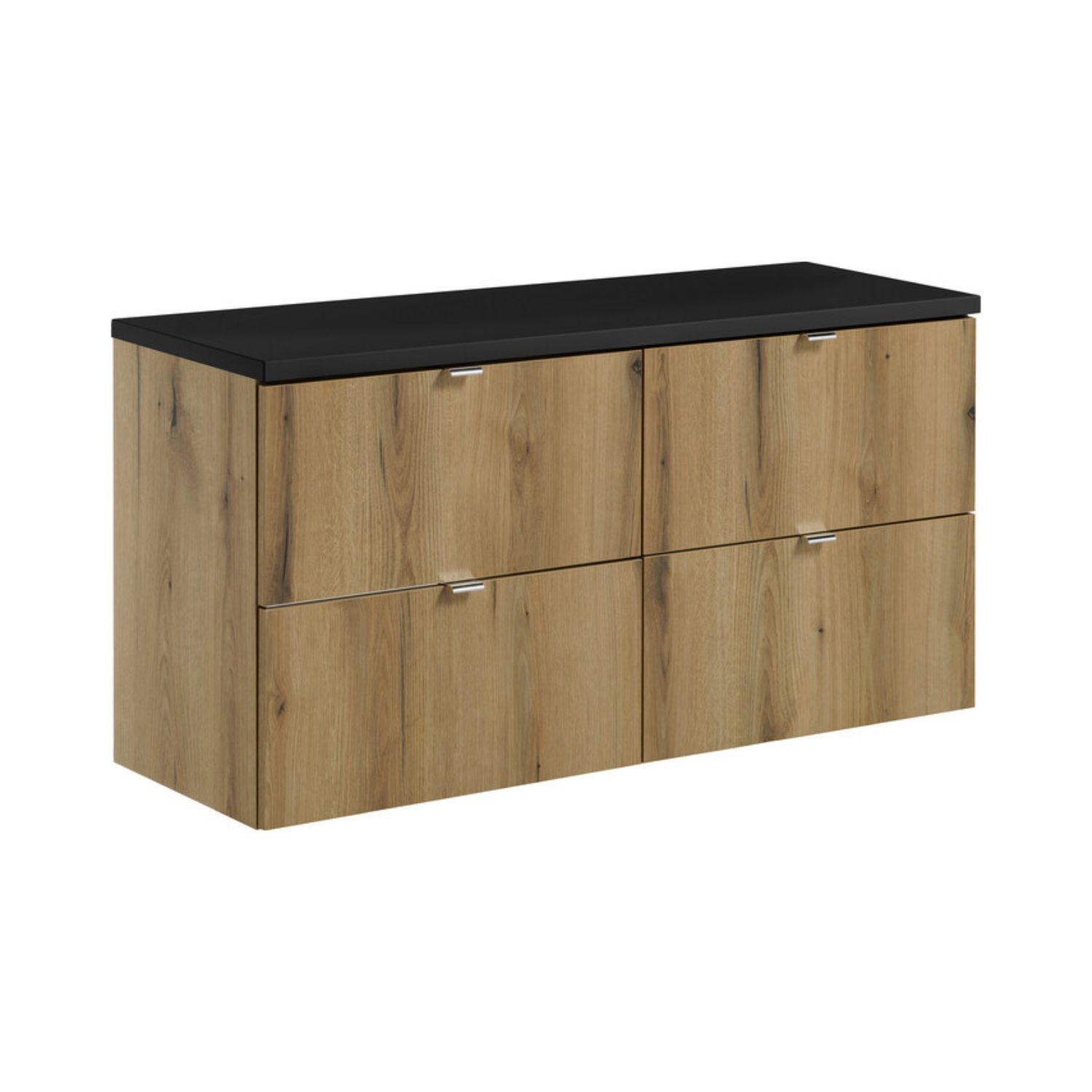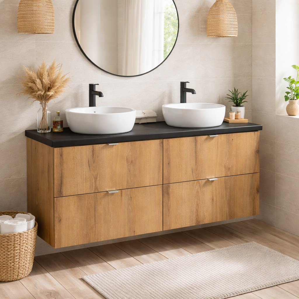 Les meubles sous vasque suspendus à tiroirs sont proposés en aspect chêne foncé, offrant une ambiance chaleureuse et naturelle. Ce coloris bois profond apporte du caractère tout en s’intégrant parfaitement dans une salle de bain contemporaine.