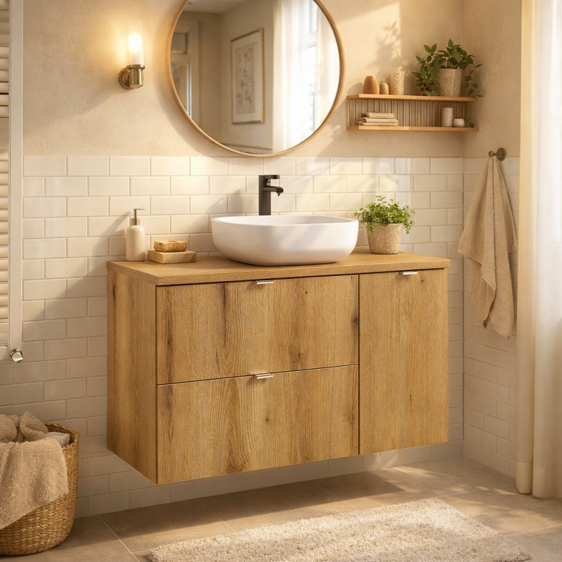 Les meubles sous vasque sont proposés en aspect chêne foncé, une finition chaleureuse qui apporte du caractère et une ambiance naturelle à votre pièce.