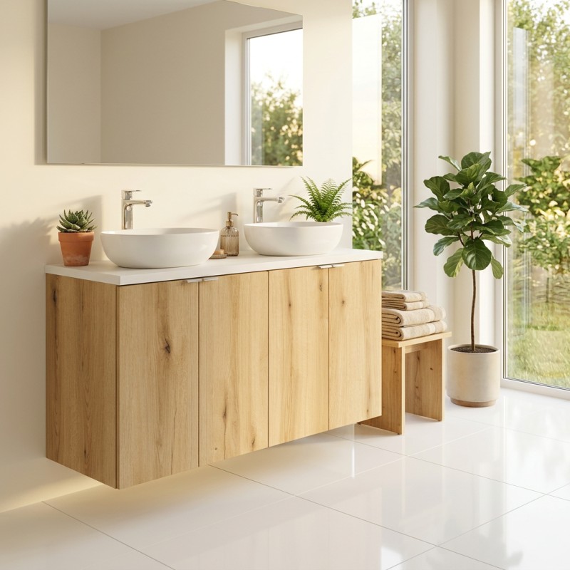 Le plan pour vasque blanc crée un contraste moderne avec la finition chêne foncé des meubles, apportant luminosité et élégance à votre salle de bain.