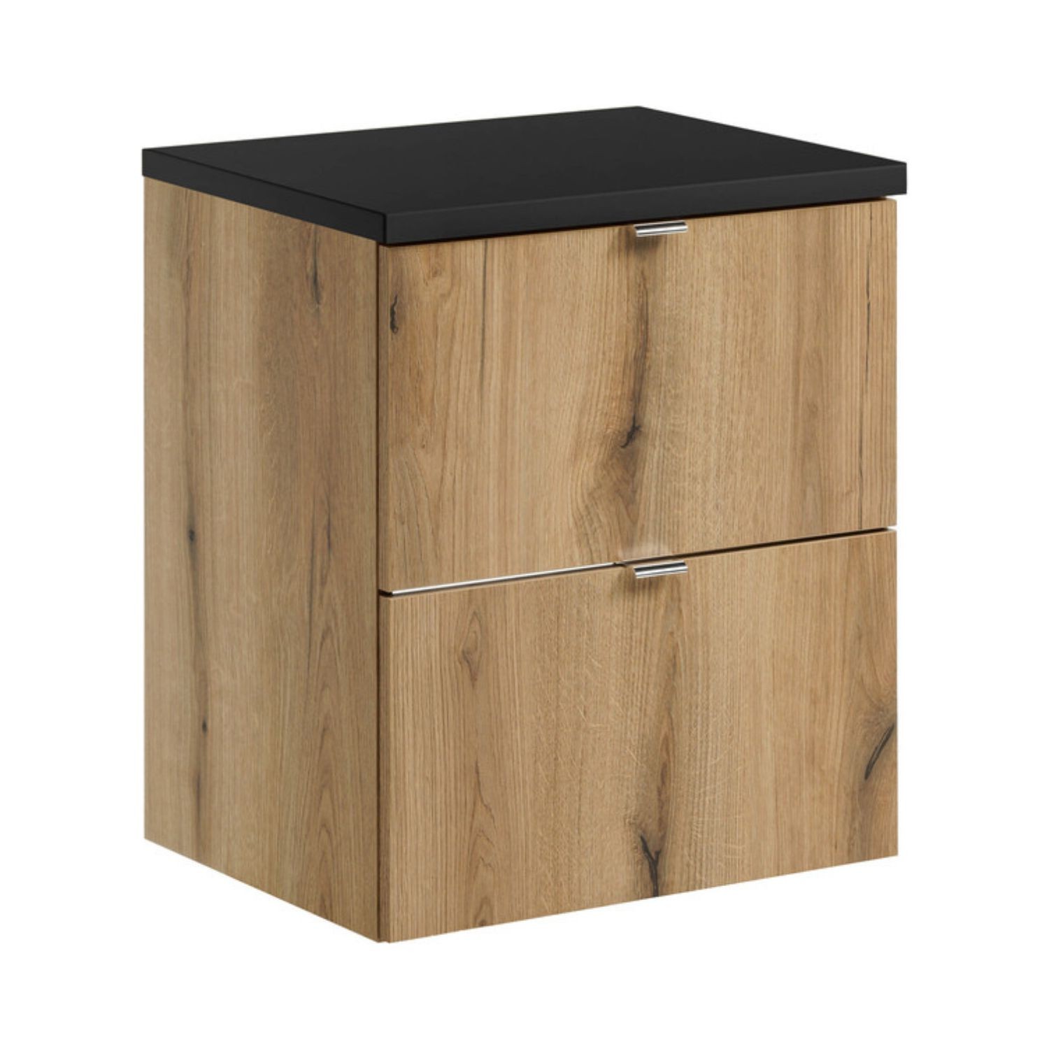 Le plan pour vasque noir apporte une note moderne et élégante, créant un contraste marqué avec le chêne foncé pour un rendu visuel affirmé.