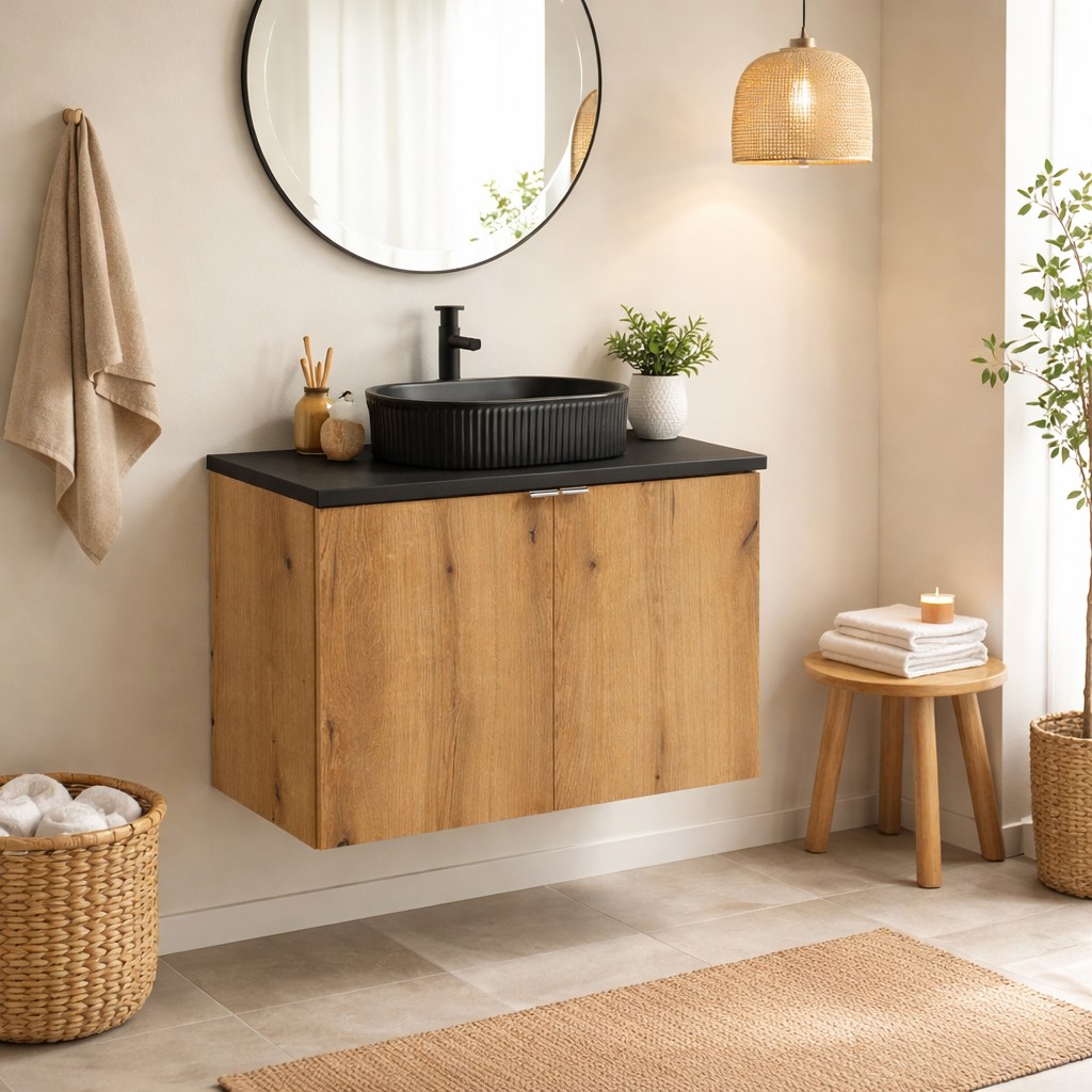 Grâce à sa pose suspendue, ce meuble libère visuellement l’espace et facilite l’entretien du sol au quotidien.