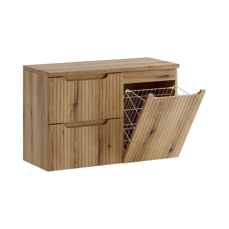 Ce meuble combine intelligemment un module avec 2 tiroirs coulissants en chêne clair pour un rangement structuré et un panier à linge intégré avec porte abattante, idéal pour dissimuler votre linge en toute discrétion.