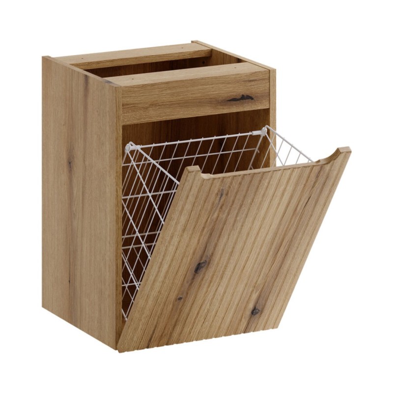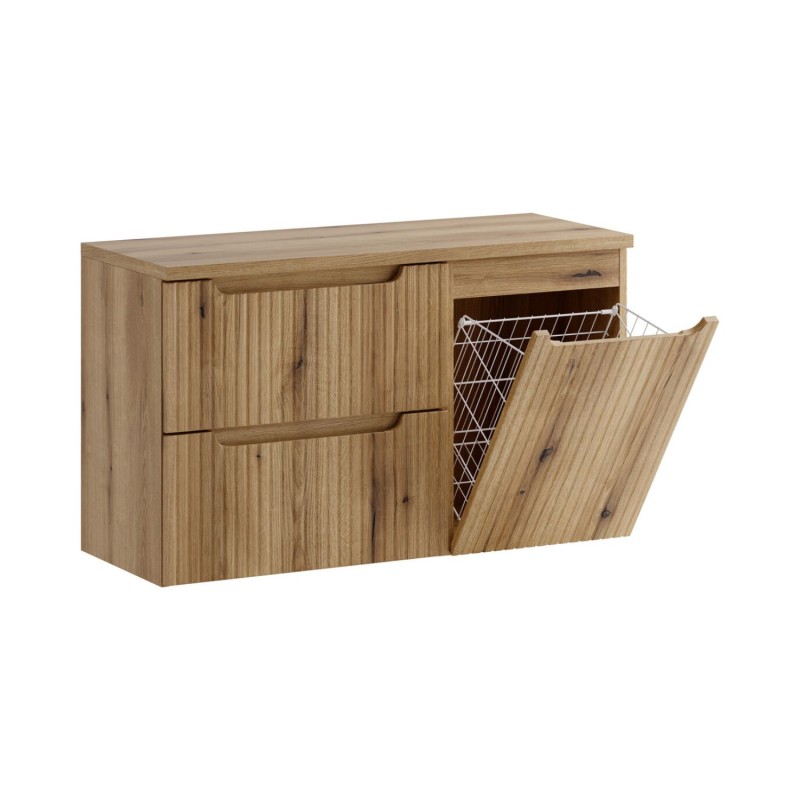 Ce meuble associe un module avec 2 tiroirs coulissants en chêne clair pour organiser vos essentiels et un panier à linge intégré avec ouverture dédiée, idéal pour un rangement discret et fonctionnel.