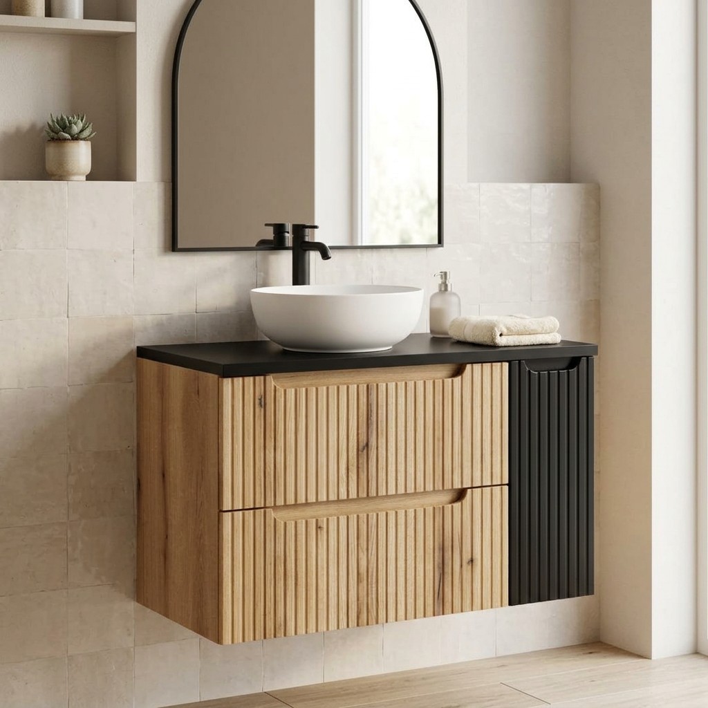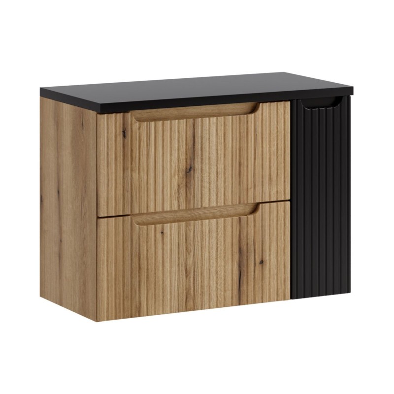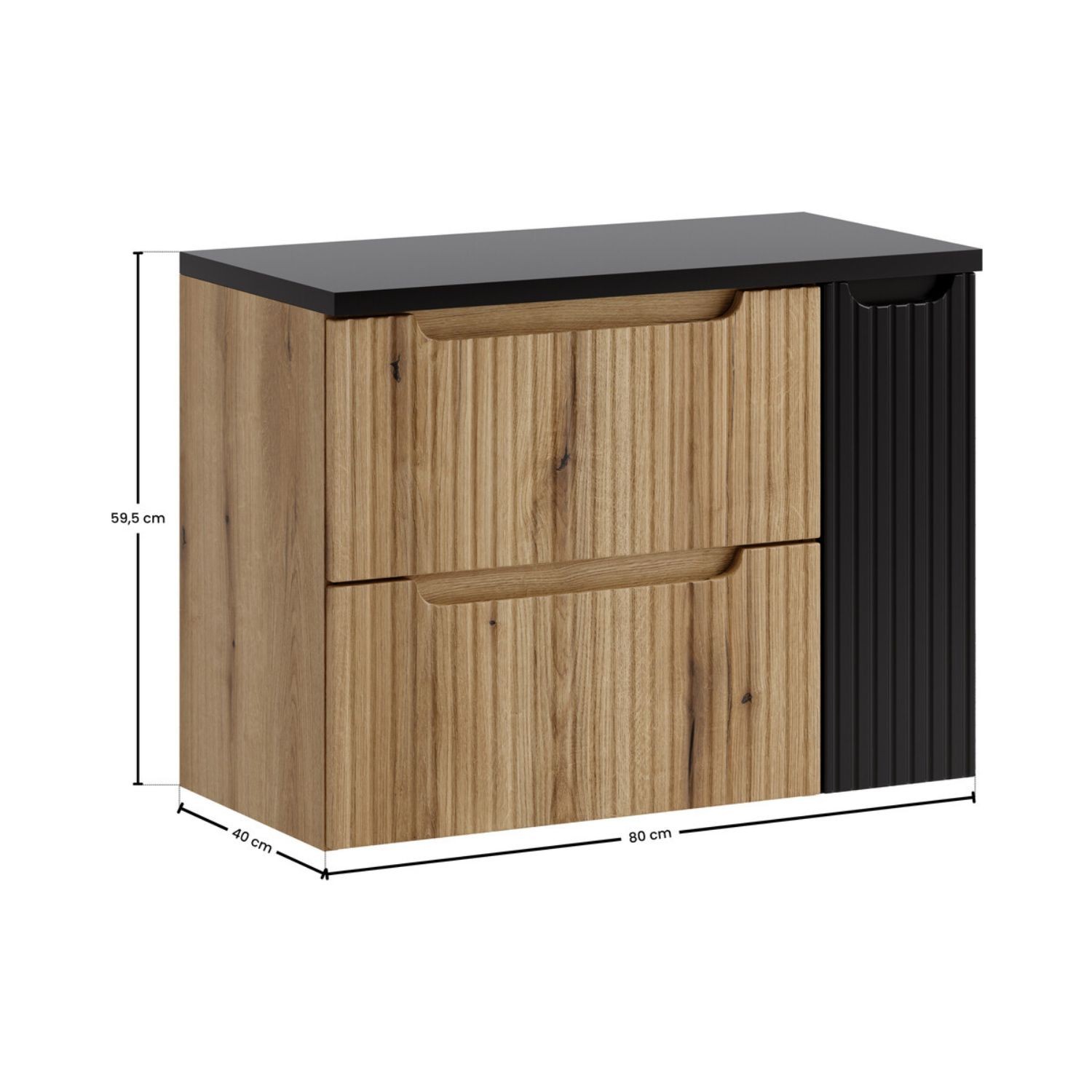 Apportez du contraste et du caractère à votre salle de bain avec ce meuble sous vasque VANO 80 cm, alliant un élégant chêne clair à des éléments noirs modernes.