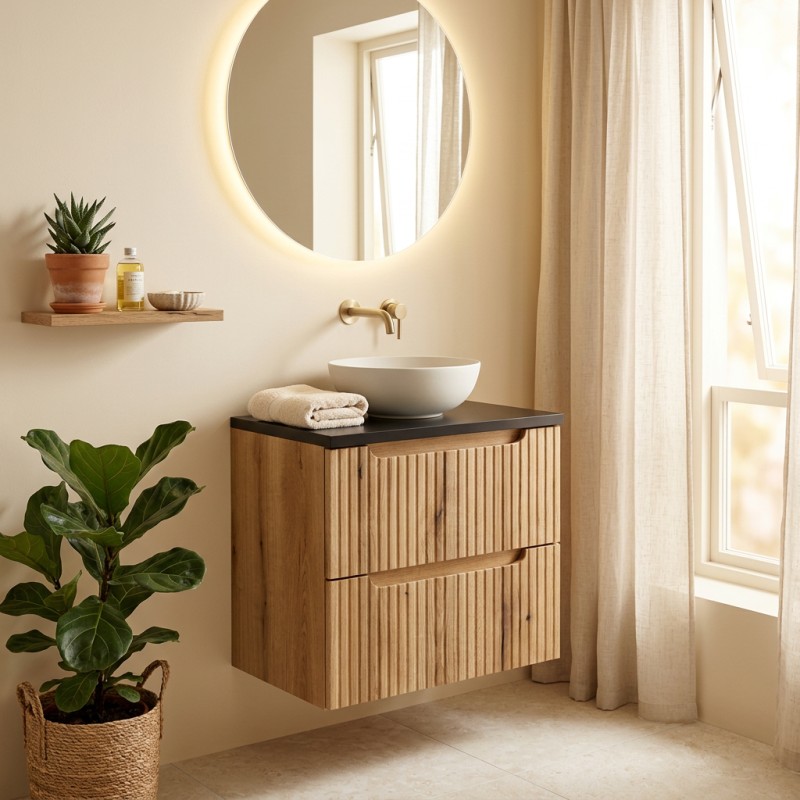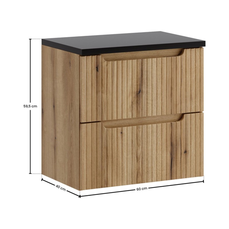 Apportez du contraste et de la modernité à votre salle de bain avec ce meuble sous vasque VANO 60 cm, combinant un chaleureux aspect chêne clair et un élégant plan pour vasque noir.