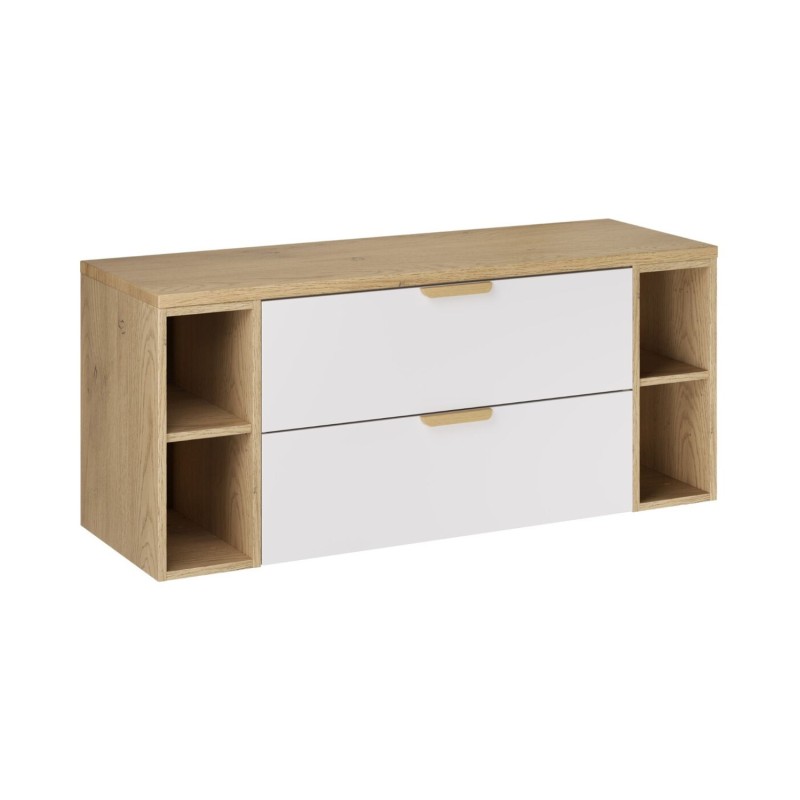 Cet ensemble comprend un meuble sous vasque avec tiroirs en blanc mat et deux modules avec niches ouvertes en chêne clair, offrant une solution de rangement complète, pratique et esthétique.