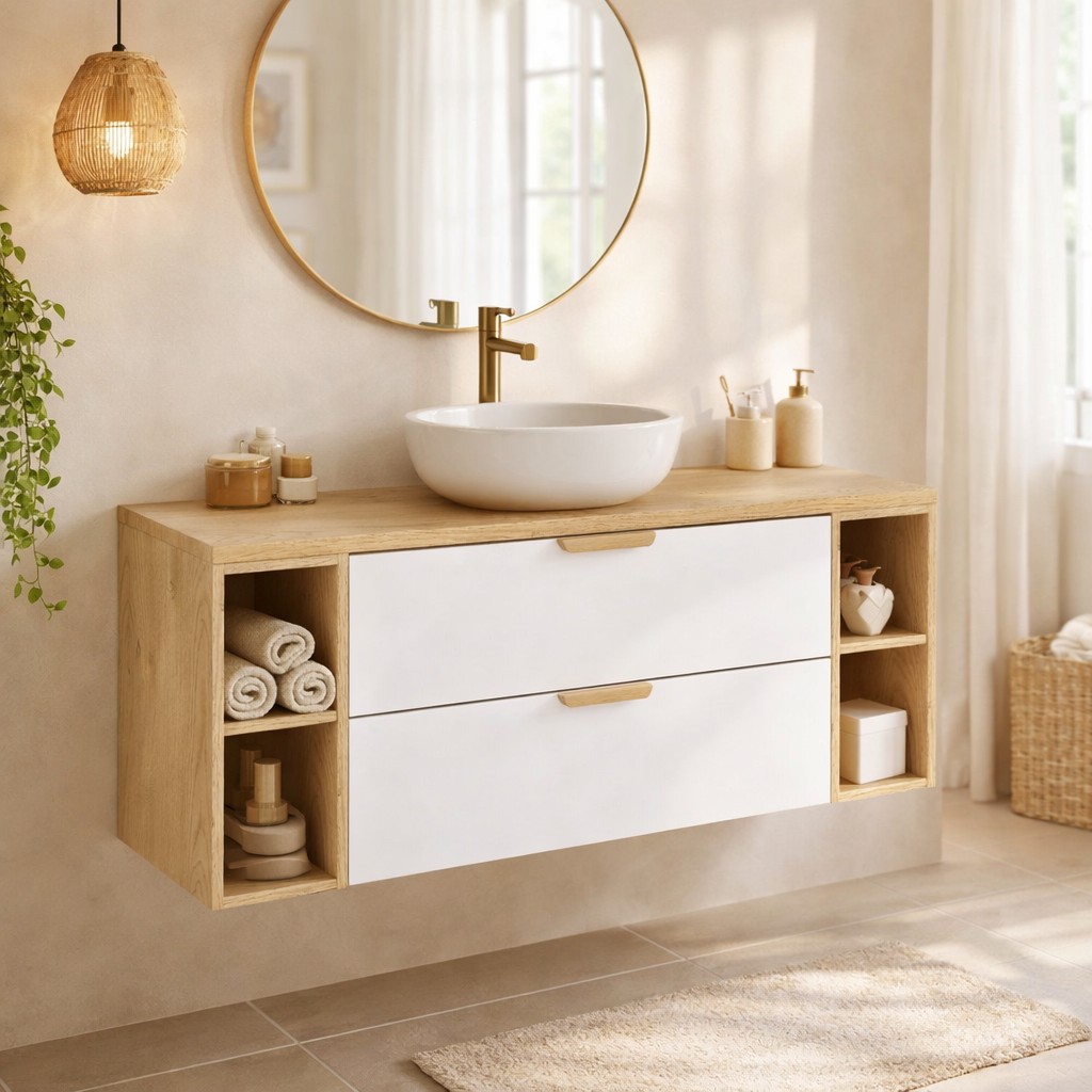Les niches visibles en chêne clair permettent de garder vos essentiels à portée de main tout en apportant une touche naturelle et chaleureuse à votre salle de bain.