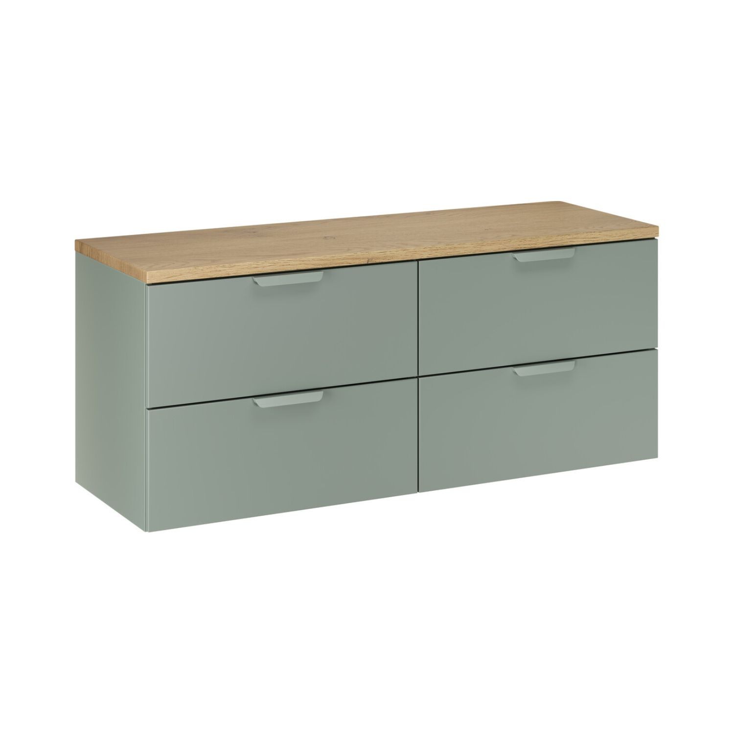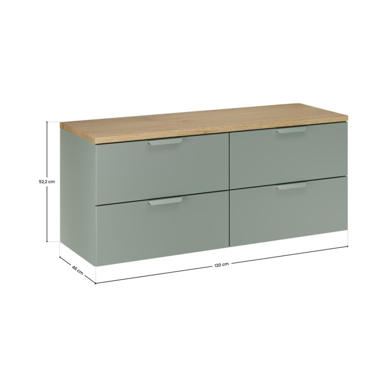 Aménagez votre espace avec cet ensemble meuble sous vasque OSTER 120 cm, composé de deux meubles à tiroirs vert sauge et d’un plan pour vasque aspect chêne clair, pour un rendu à la fois moderne et chaleureux.