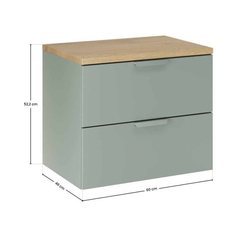 Apportez une touche moderne et naturelle à votre intérieur avec cet ensemble meuble sous vasque OSTER 60 cm, composé d’un meuble à tiroirs vert sauge et d’un plan pour vasque aspect chêne clair.