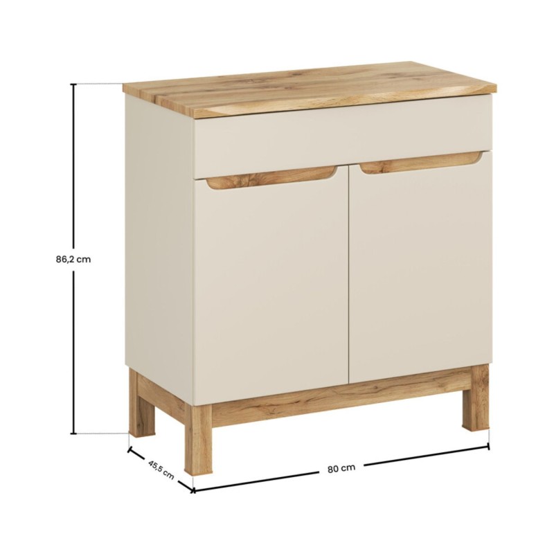 | Dimensions des éléments (en cm) | 1 meuble sous vasque 2 portes : 80x84x46 + 1 plan pour vasque biseauté : 80,6x2,2x47,5 |