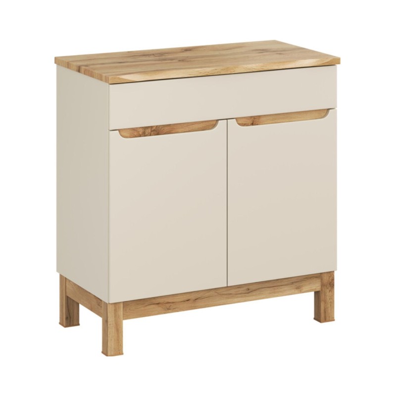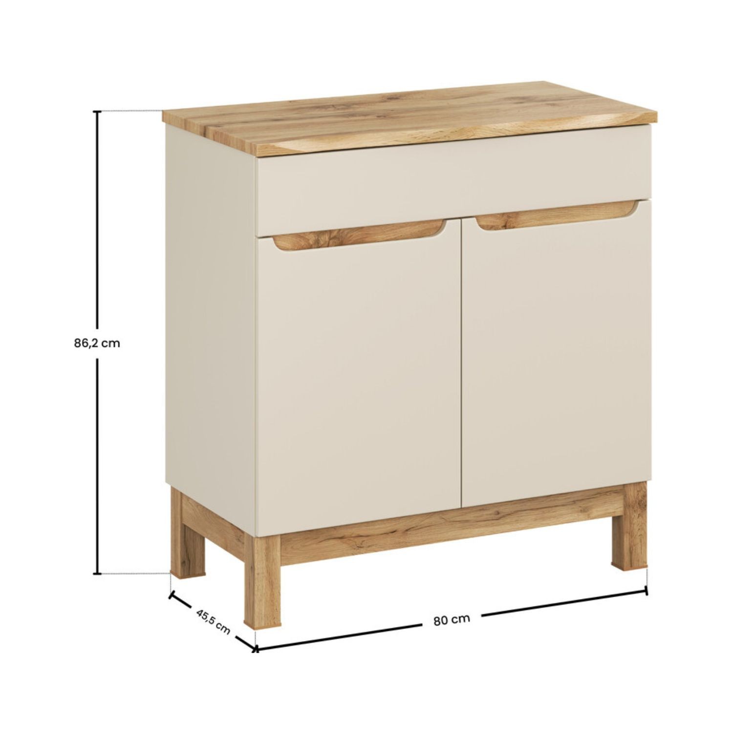 Son association de coloris cachemire et d’aspect chêne clair crée une ambiance douce et naturelle, parfaite pour une salle de bain contemporaine et chaleureuse.