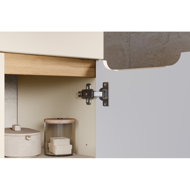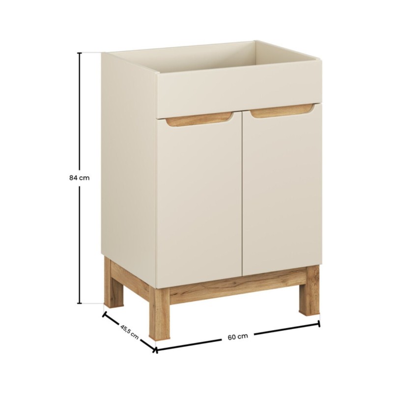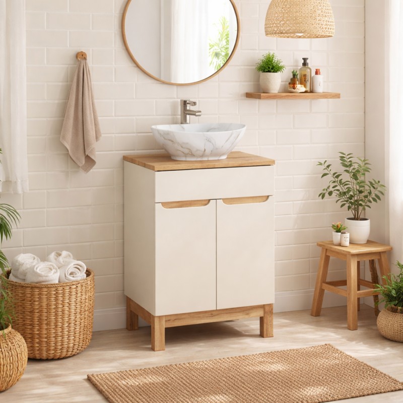 Apportez une touche d’élégance et de douceur à votre salle de bain avec ce meuble sous vasque ERMANO 60 cm, conçu dans un coloris cachemire raffiné, sublimé par des détails en chêne clair pour une ambiance naturelle et apaisante.