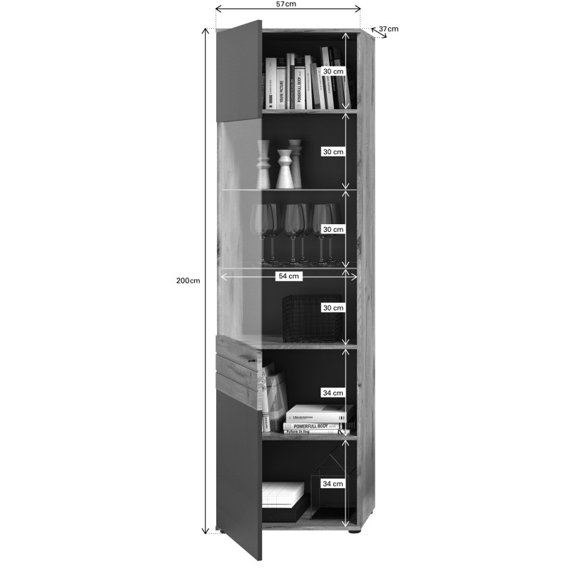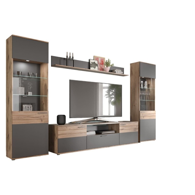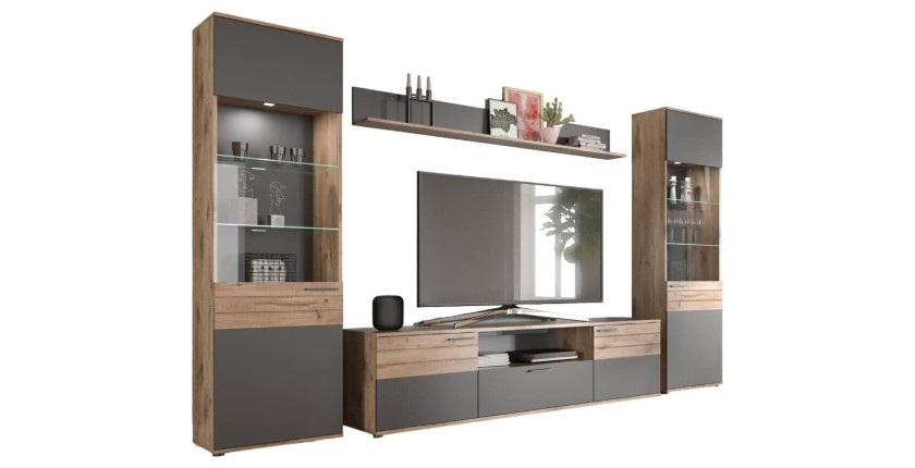 Transformez votre salon avec l'Ensemble de salon complet SELMA, qui comprend un meuble TV, deux vitrines et une étagère. Conçu dans un élégant gris anthracite et chêne clair, cet ensemble est parfait pour apporter style et organisation à votre espace de vie.