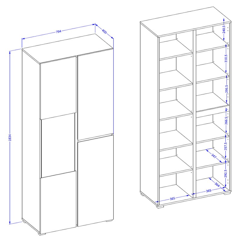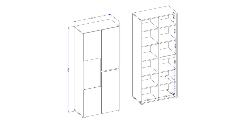 | Dimensions des éléments (en cm) | Meuble TV : 225x48x40 - Vitrine : 80x183x40 - Table basse : 120x48x60 - Étagère : 180x23x23 |