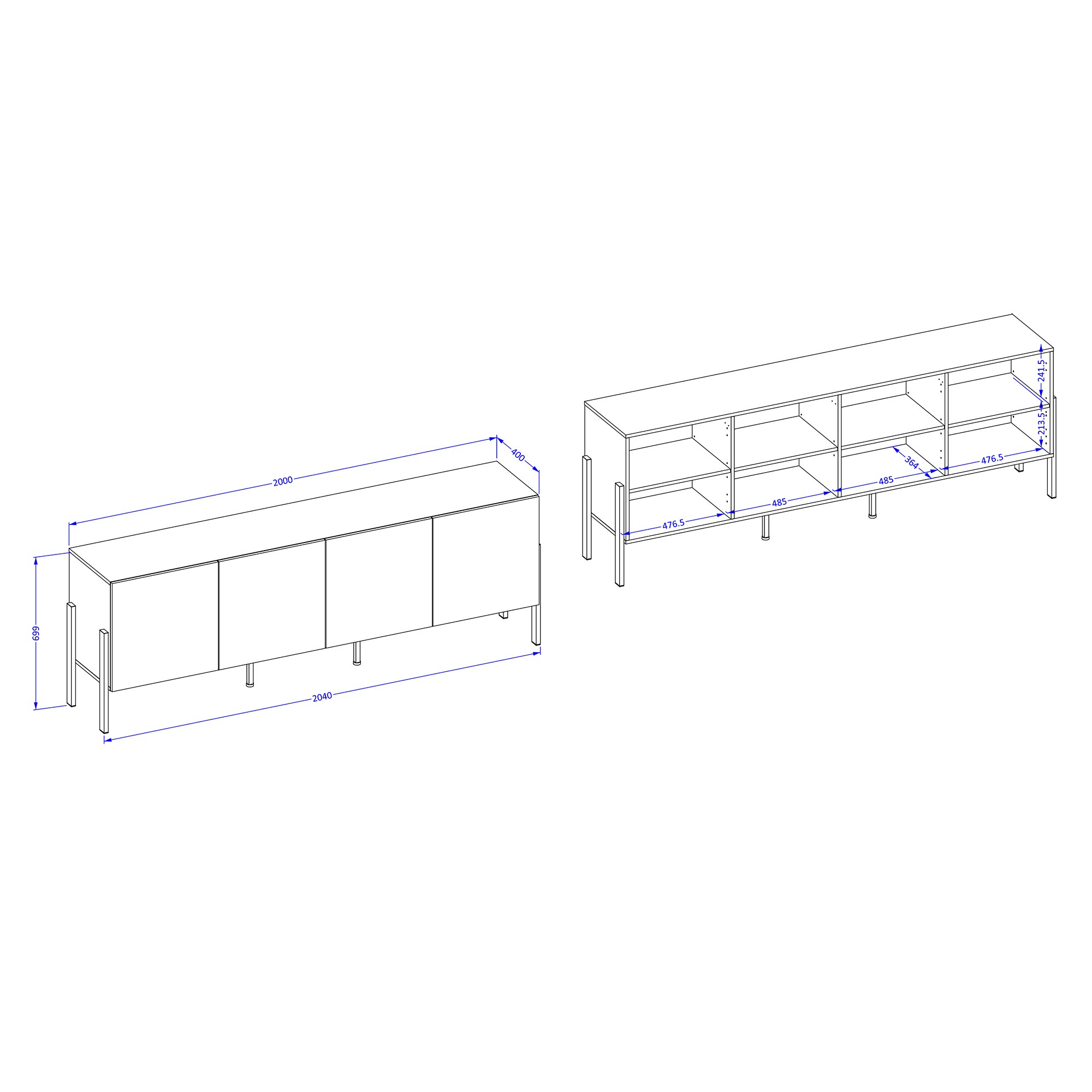| Dimensions des éléments (en cm) | buffet 4 portes 204×70×40 cm, armoire 114×135×40 cm, buffet 154×90×40 cm |