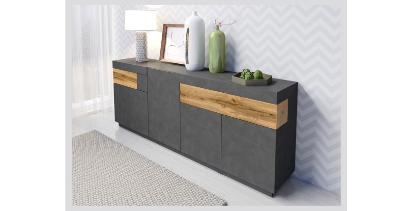 - COLORIS : Corp du meuble couleur gris anthracite. Portes couleurs gris béton et chêne.