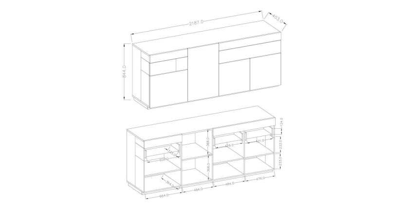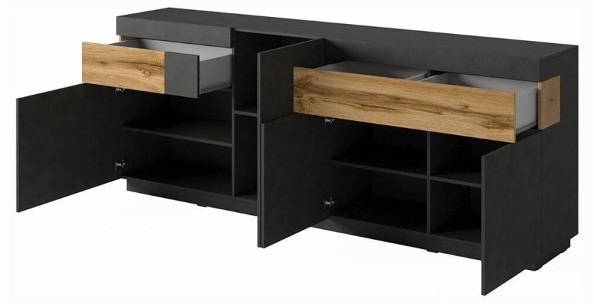 - CARACTÉRISTIQUES : Vitrine partiellement vitrée, éclairage LED intégré. Grand espace de rangement grâce à ses nombreuses étagères. Buffet composé de quatre portes avec de nombreuses étagères à l'intérieur et deux tiroirs.