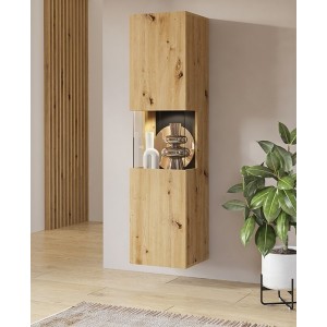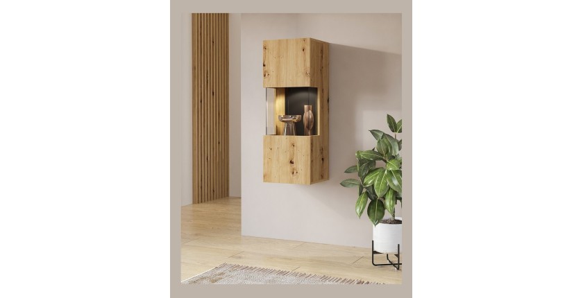 * Vitrine suspendue : Grand espace de rangement grâce à ses nombreuses étagères. Meuble composé d'une porte partiellement vitrée. Possibilité de configurer la porte avec ouverture vers la gauche ou vers la droite.