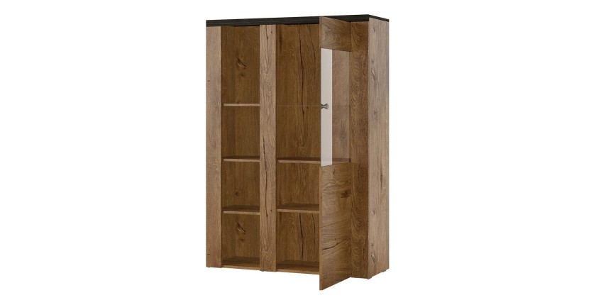 * Vitrine : Grand espace de rangement. Vitrine composée d'une grande porte battante partiellement vitrée. Éclairage LED intégré.