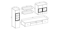 | Dimensions des éléments (en cm) | Meuble TV : 210x35x39,5 - Vitrine (x2) : 45x80x29,5 - Étagères (x2) : 80x15x16,5cm - Grande vitrine : 45x160x39cm |