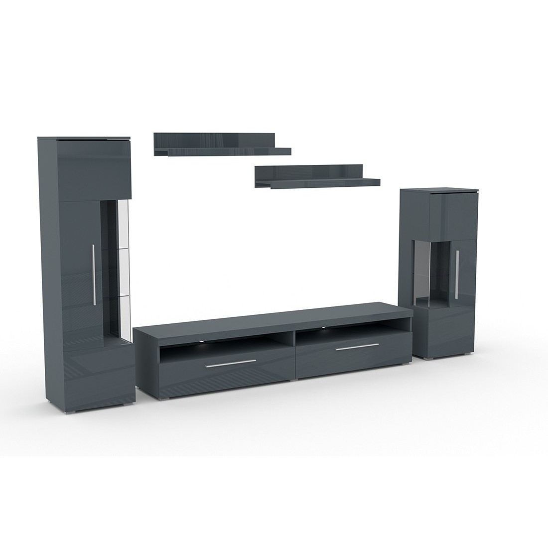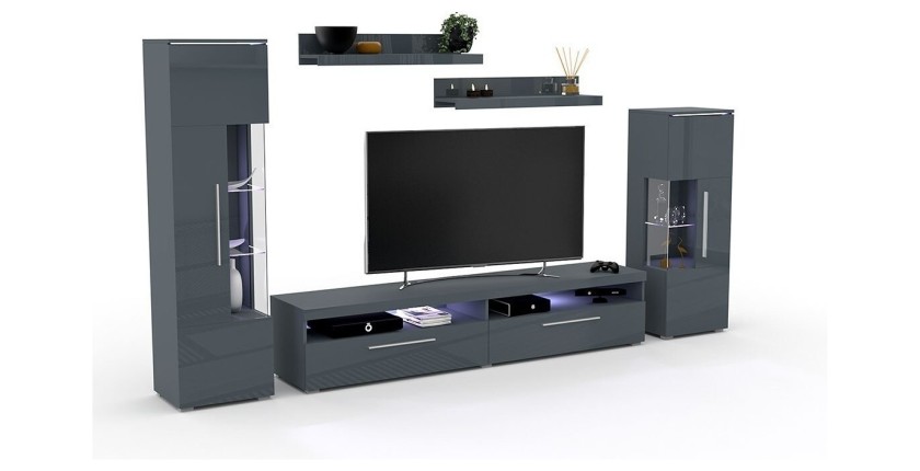 Avec cette composition de meubles de la collection BOMBAY coloris gris brillant offrez à votre salon un style unique, au top des dernières tendances déco. Cet ensemble de meubles BOMBAY est composé de deux vitrines, 2 étagères et 1 grand meuble TV offrant ainsi de nombreux rangements.