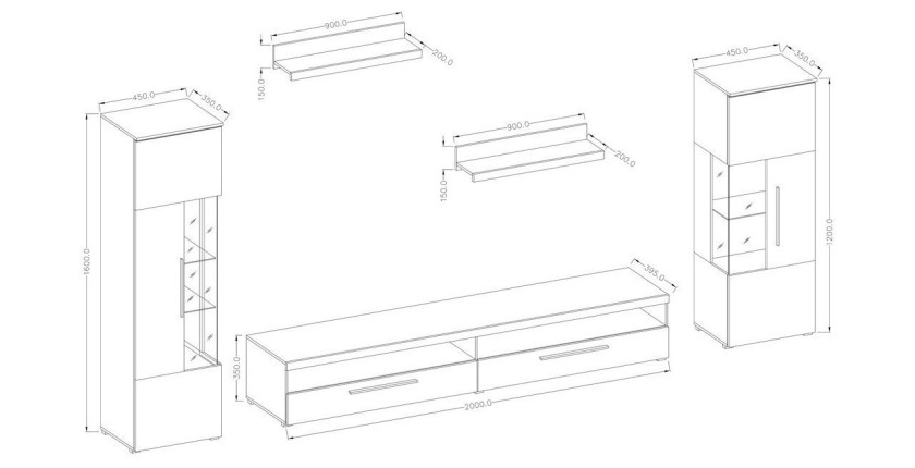 | Dimensions des éléments (en cm) | Meuble TV : 200x35x39,5 - Petite vitrine : 45x125x35 - Grande vitrine : 45x160x35 - Étagères : 60x15x20cm |
