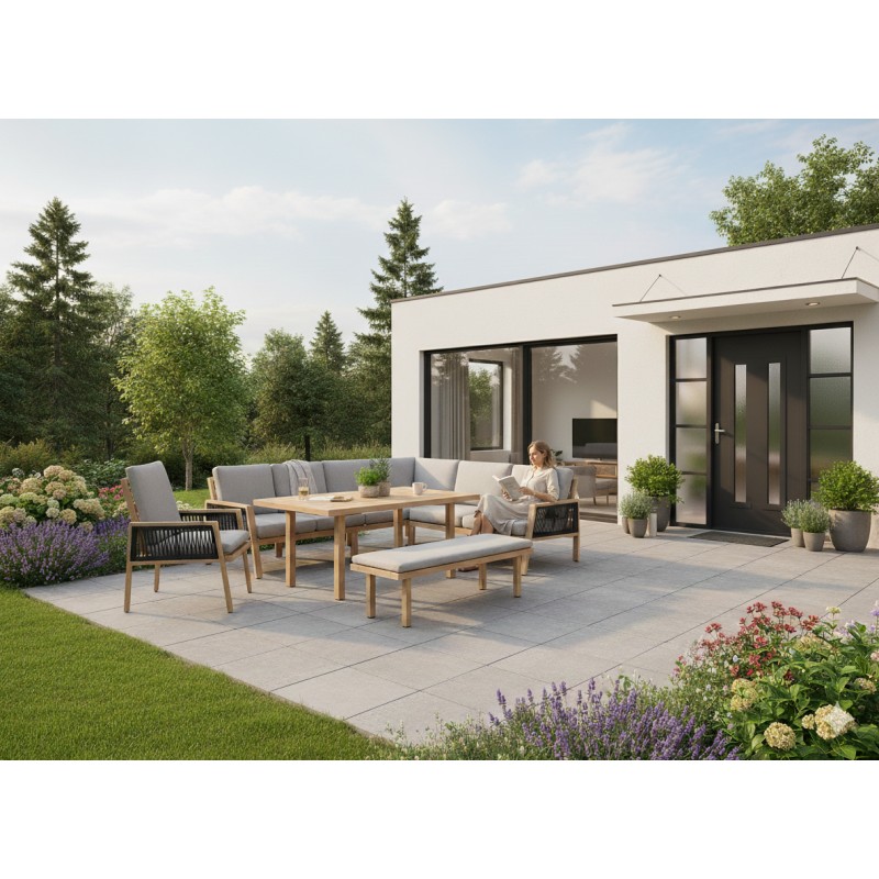 Sa composition généreuse comprend deux canapés 2 places, un module d’angle, un module central, un fauteuil, un banc et une table basse. Cette configuration permet de créer un véritable espace lounge modulable, harmonieux et convivial, parfaitement adapté aux grandes réceptions comme aux moments de repos au quotidien.