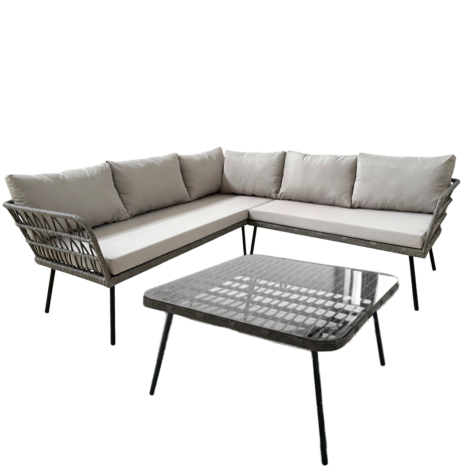 Aménagez un espace extérieur moderne et convivial avec ce salon de jardin d’angle de la collection RATTANIA. Conçu pour accueillir jusqu’à 5 personnes, cet ensemble élégant comprend un canapé d’angle (3 places + 2 places) et une table basse avec plateau en verre.