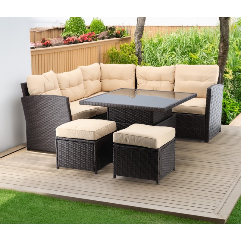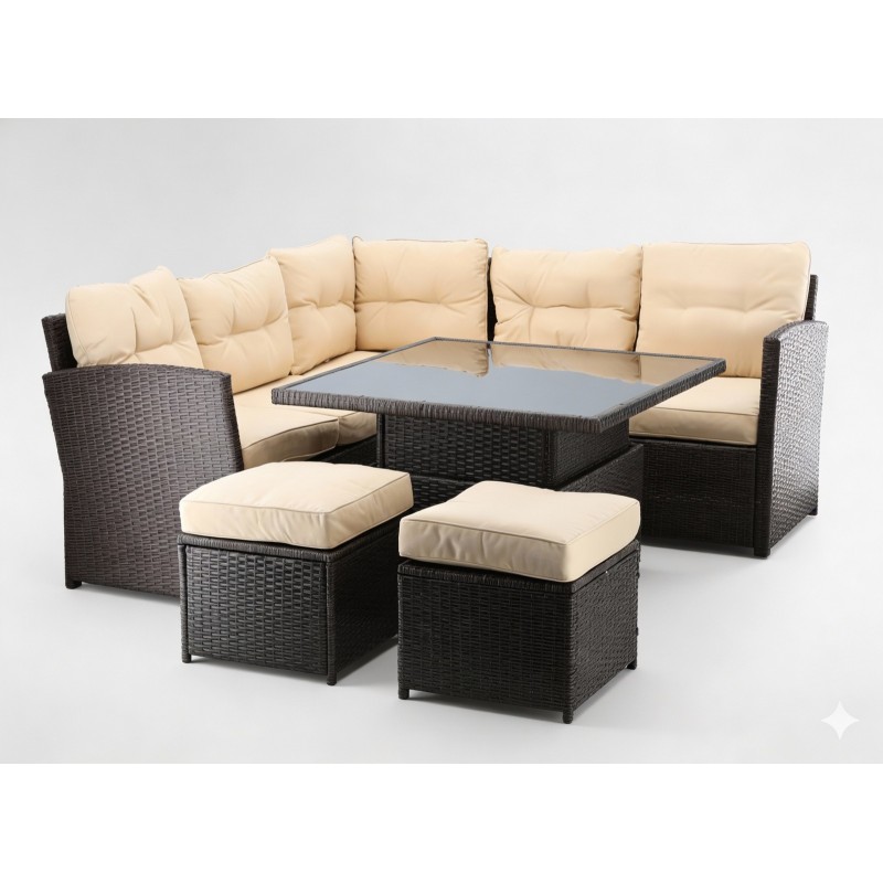 Son design naturel en rotin synthétique brun s’associe parfaitement à des coussins crème pour créer une ambiance douce, raffinée et intemporelle. Le canapé d’angle spacieux est complété par deux poufs pratiques, parfaits pour augmenter le nombre de places ou servir de repose-pieds pour un confort optimal.