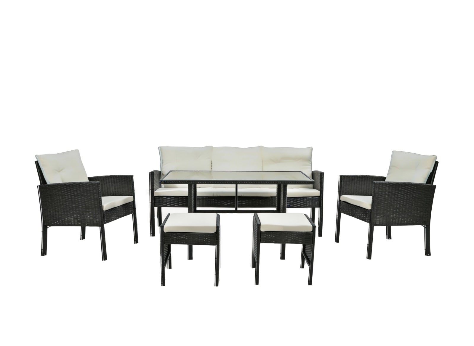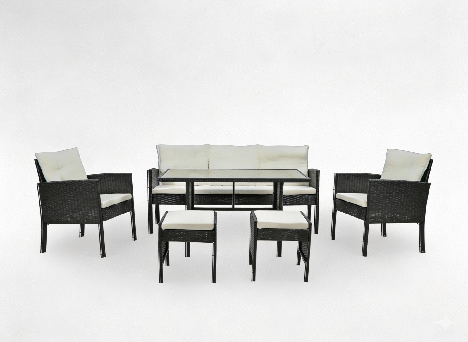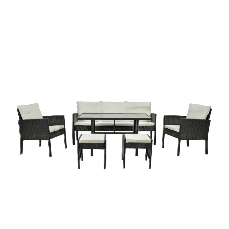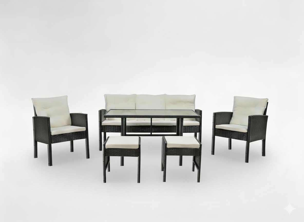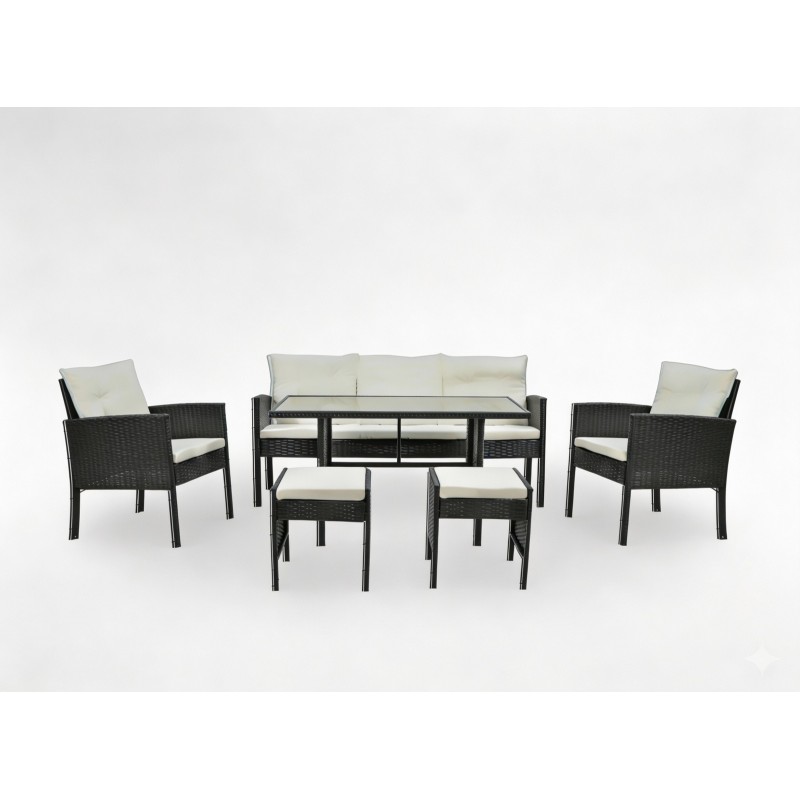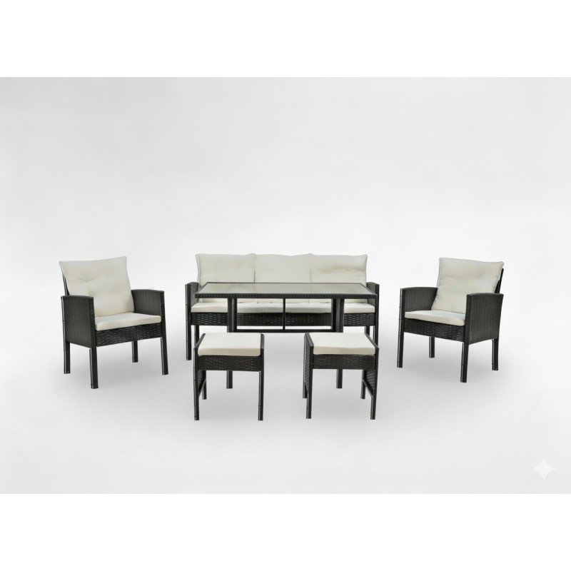 Composé d’un canapé 3 places, de deux fauteuils confortables, de deux poufs pratiques et d’une grande table, ce salon de jardin est parfait pour partager des moments de détente ou des repas en plein air.