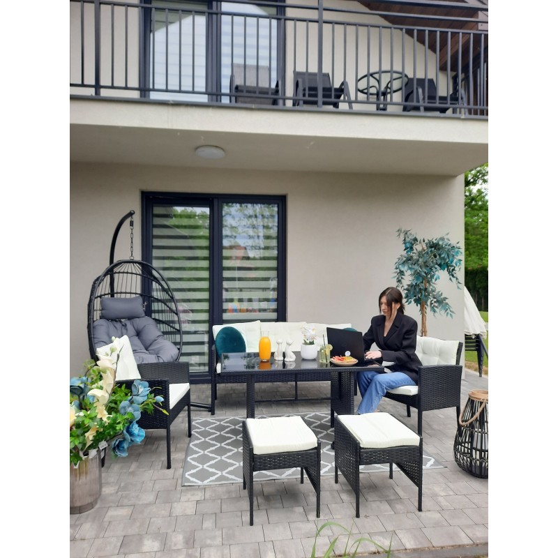 Sa structure en acier galvanisé et son revêtement en rotin synthétique garantissent robustesse et résistance aux intempéries et aux UV. Les coussins épais assurent un confort optimal au quotidien.