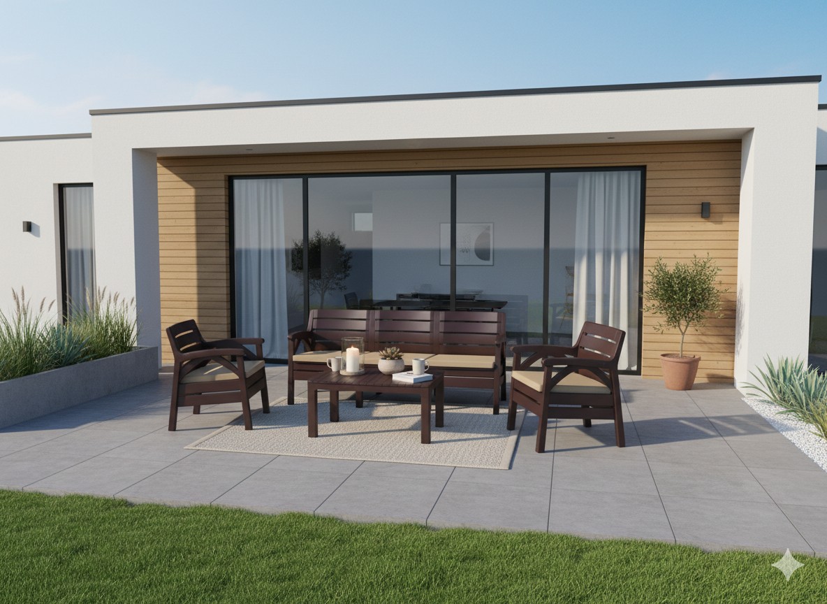 La table basse complète parfaitement l’ensemble en offrant une surface idéale pour poser boissons, accessoires ou objets décoratifs, rendant votre espace extérieur aussi fonctionnel qu’esthétique.