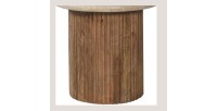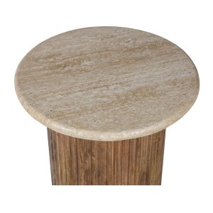Le plateau en pierre travertin, aux nuances minérales uniques, repose sur une base stable en bois exotique. Avec sa hauteur de 45 cm, cette table basse ronde est idéale en meuble central dans un salon chaleureux et moderne.