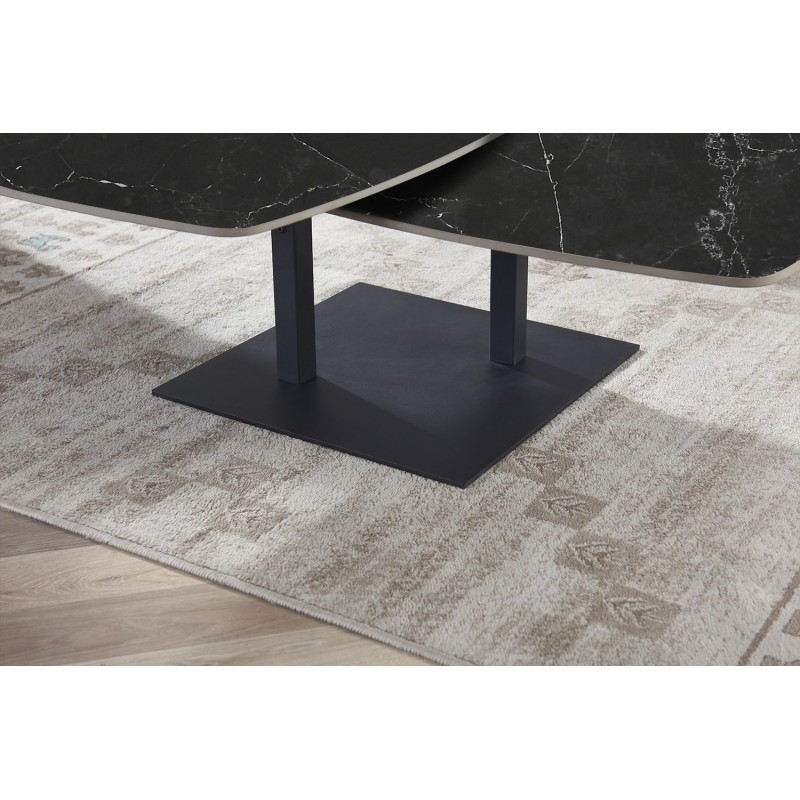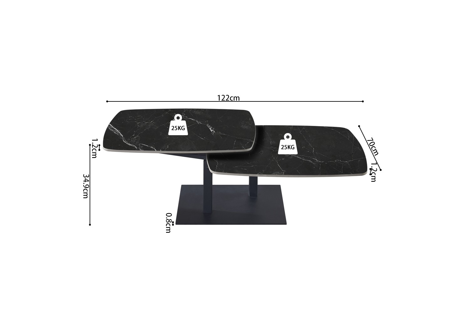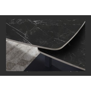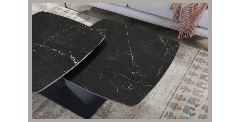 Le plateau en pierre noire repose sur une base en métal noir minimaliste, offrant un contraste visuel saisissant. Chaque plateau est une pièce unique, avec des nuances minérales subtiles qui renforcent l’aspect haut de gamme du mobilier.