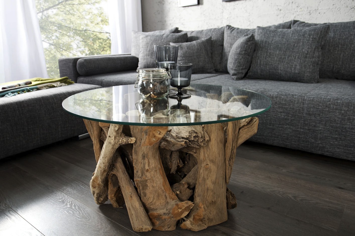 La table basse ARBOREA 60 cm séduit par son pied central en bois de teck associé à un plateau rond en verre trempé. Son design naturel et organique en fait une pièce décorative forte, idéale pour créer une atmosphère chaleureuse et apaisante dans un salon au style campagne ou naturel.