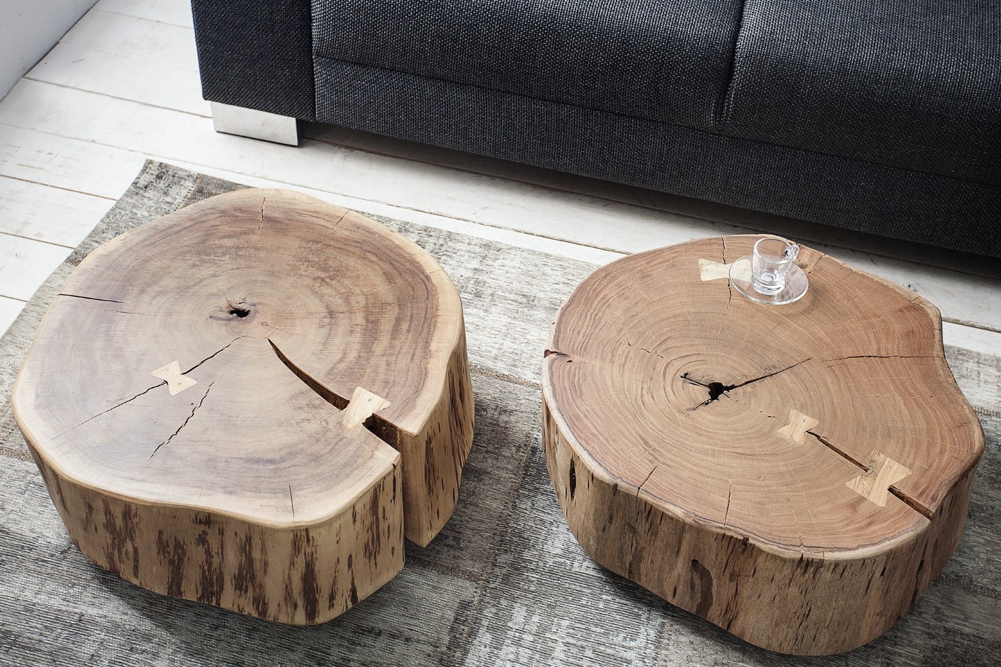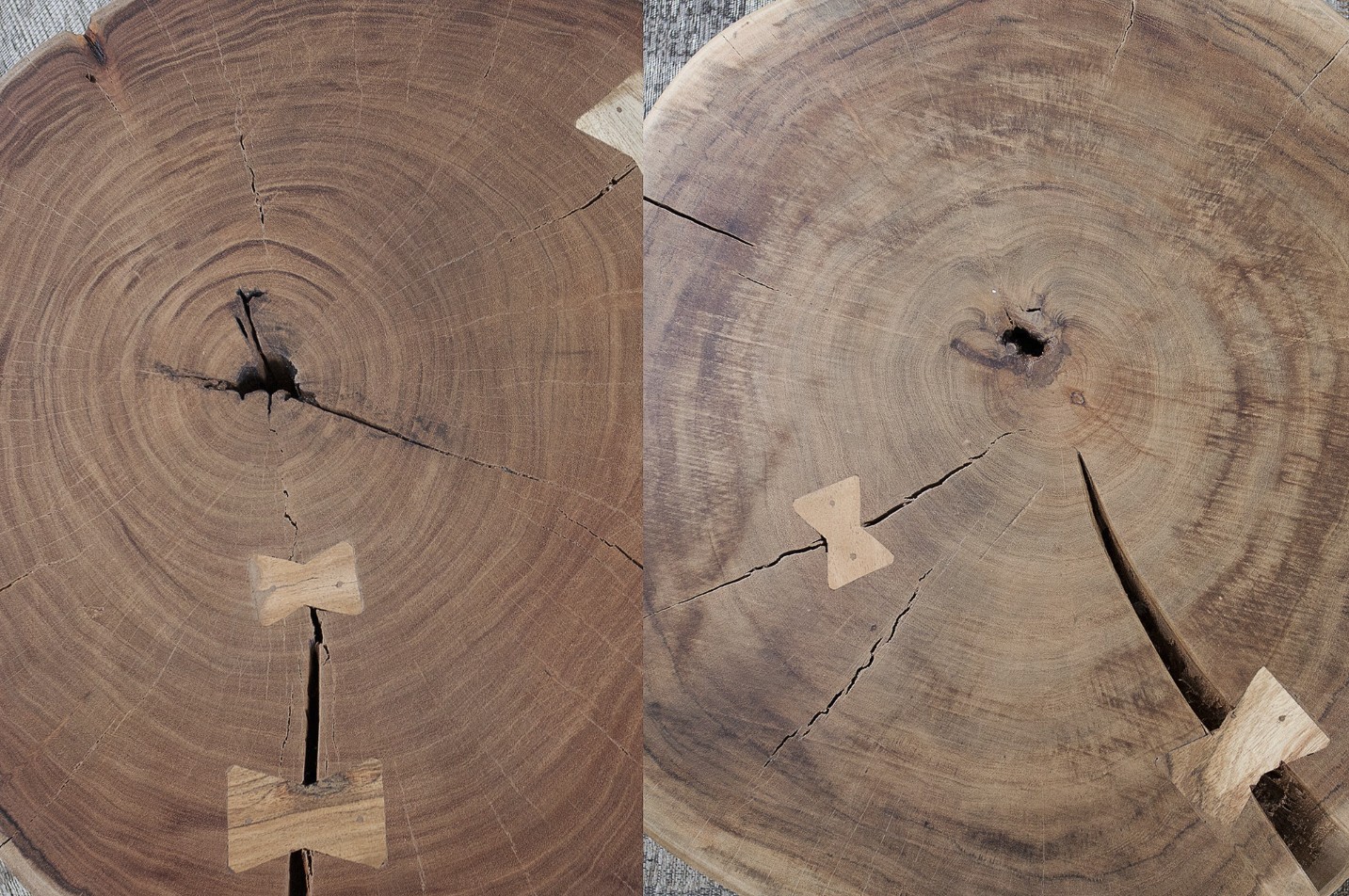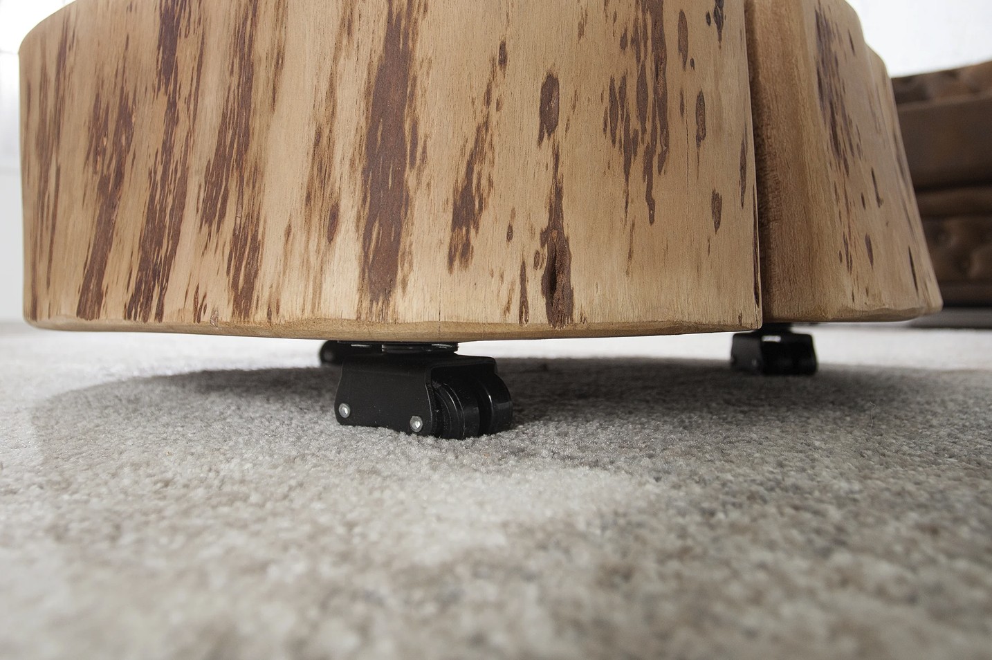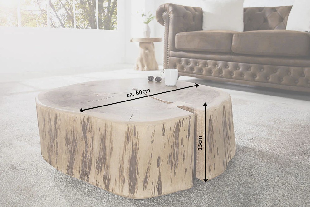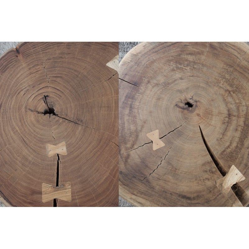 Le plateau circulaire est réalisé en bois massif d’acacia, reconnu pour sa densité et ses nuances chaleureuses. Son épaisseur exceptionnelle de 25 cm confère à la table une présence forte et un style brut, tout en mettant en valeur les veines naturelles du bois.