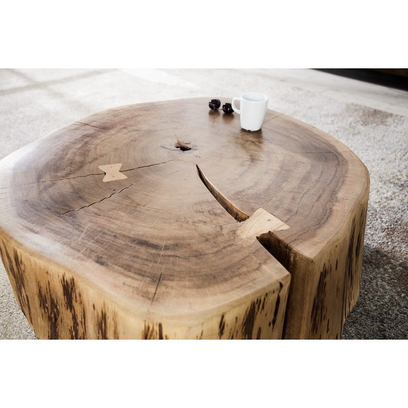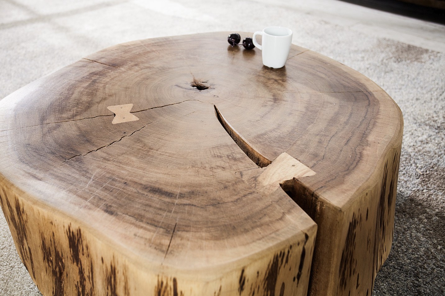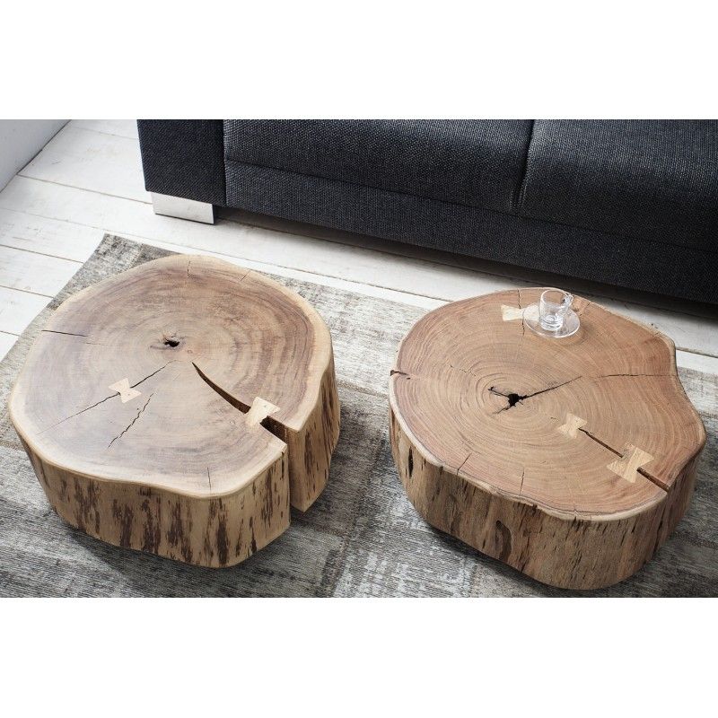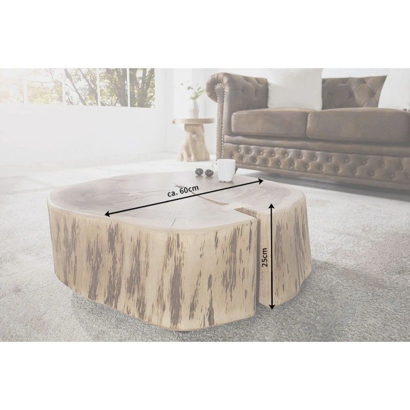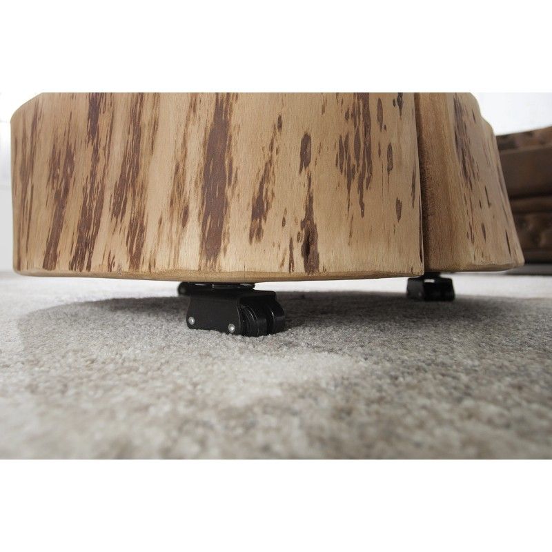Le plateau circulaire est réalisé en bois massif d’acacia, reconnu pour sa densité et ses nuances chaleureuses. Son épaisseur exceptionnelle de 25 cm confère à la table une présence forte et un style brut, tout en mettant en valeur les veines naturelles du bois.