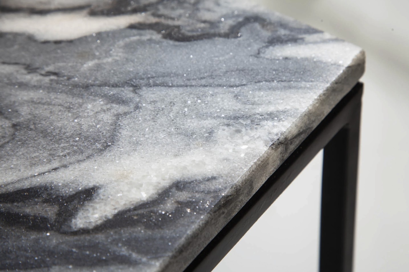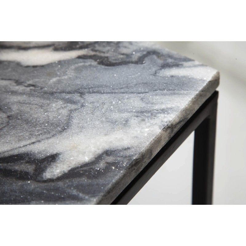 La table repose sur une structure en métal pensée pour garantir stabilité et durabilité. Les pieds sobres et fins mettent en valeur le plateau minéral sans alourdir visuellement l’ensemble, créant un équilibre harmonieux entre matière et design.