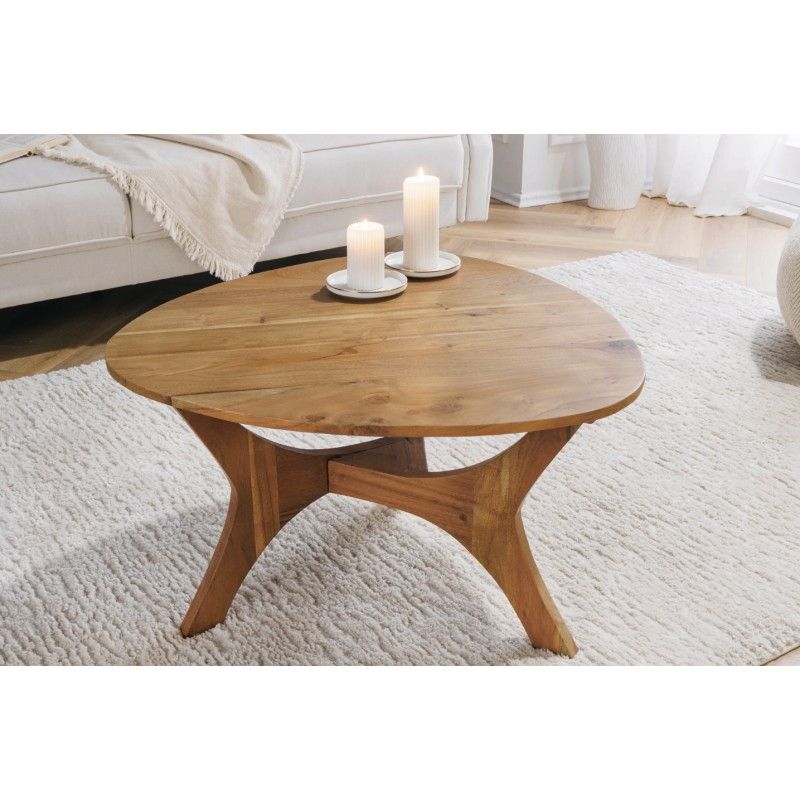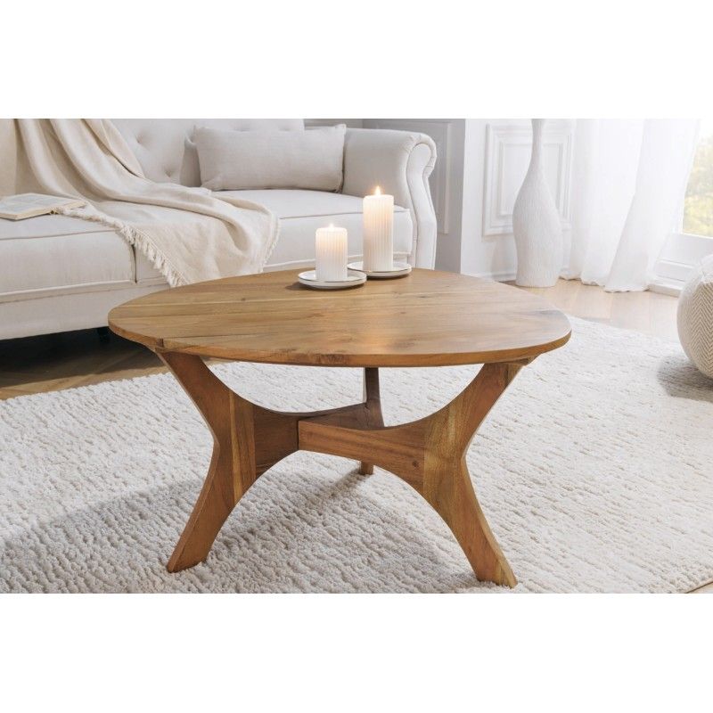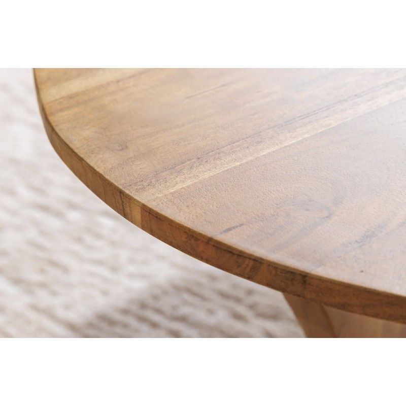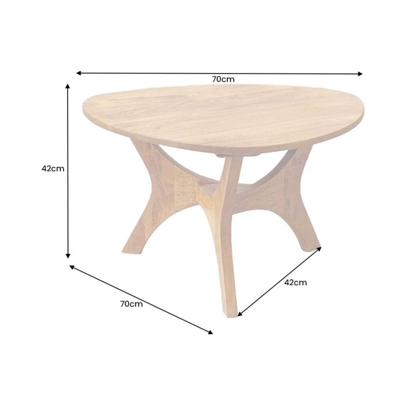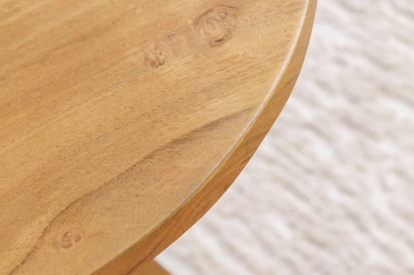 Ses pieds en bois massif aux sections fines apportent légèreté visuelle et stabilité. Leur implantation équilibrée assure un excellent maintien tout en mettant en valeur la forme ronde du plateau, idéale pour fluidifier la circulation dans le salon.