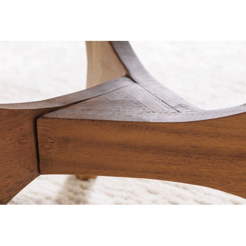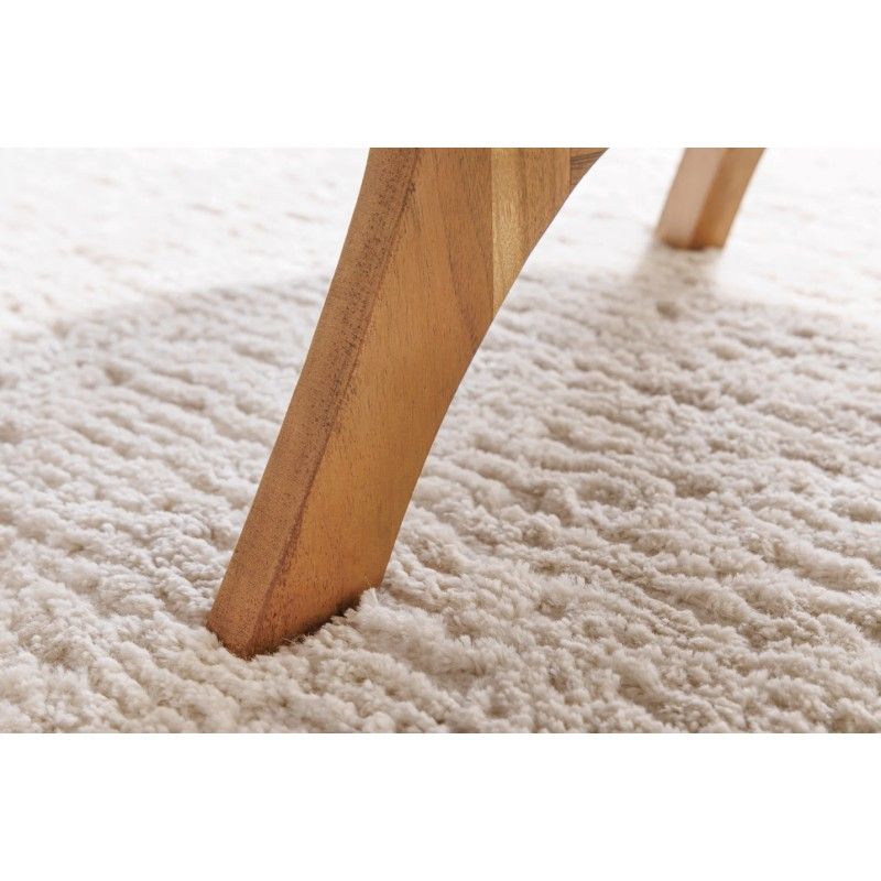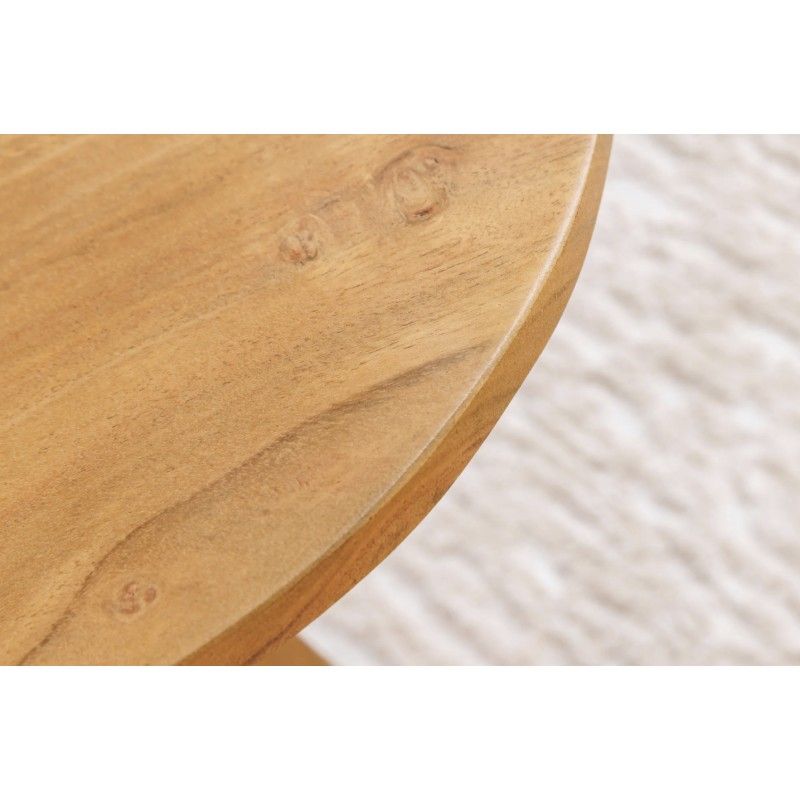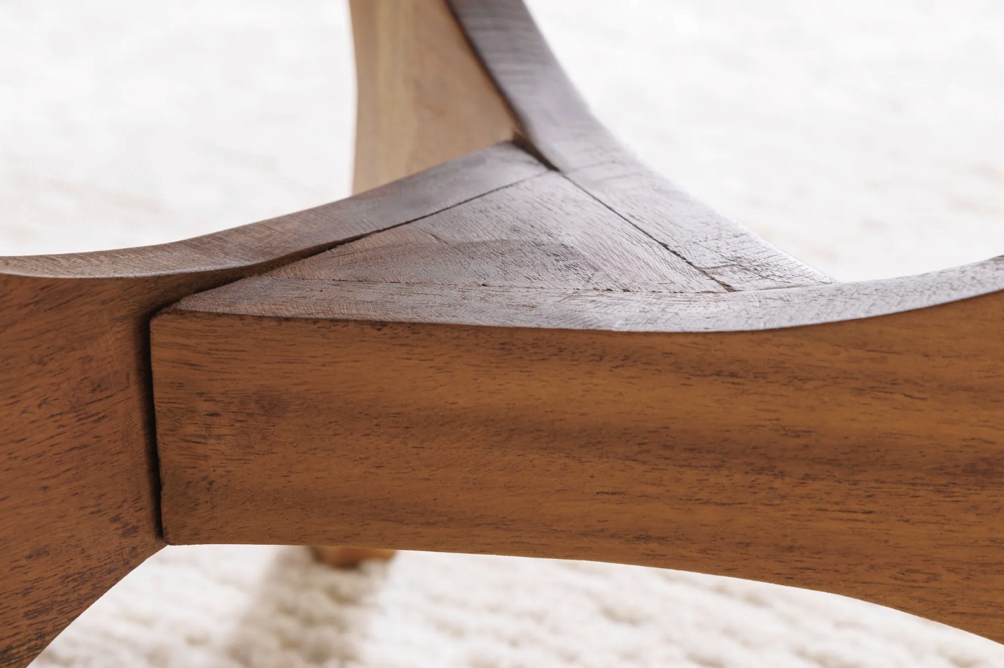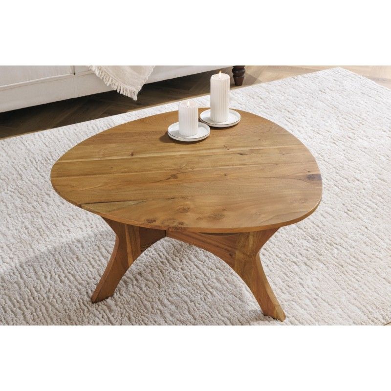 Ses pieds en bois massif aux sections fines apportent légèreté visuelle et stabilité. Leur implantation équilibrée assure un excellent maintien tout en mettant en valeur la forme ronde du plateau, idéale pour fluidifier la circulation dans le salon.