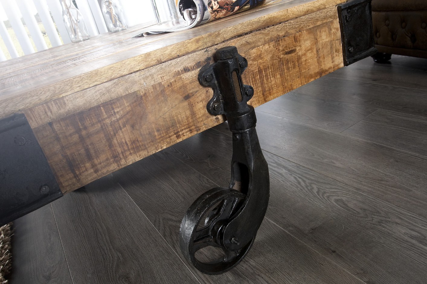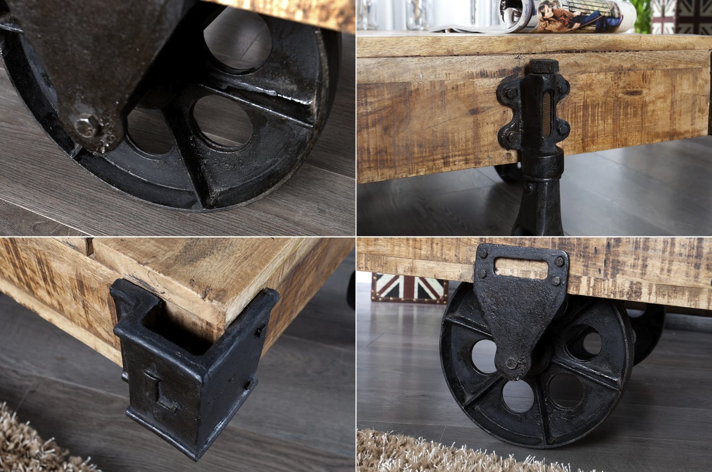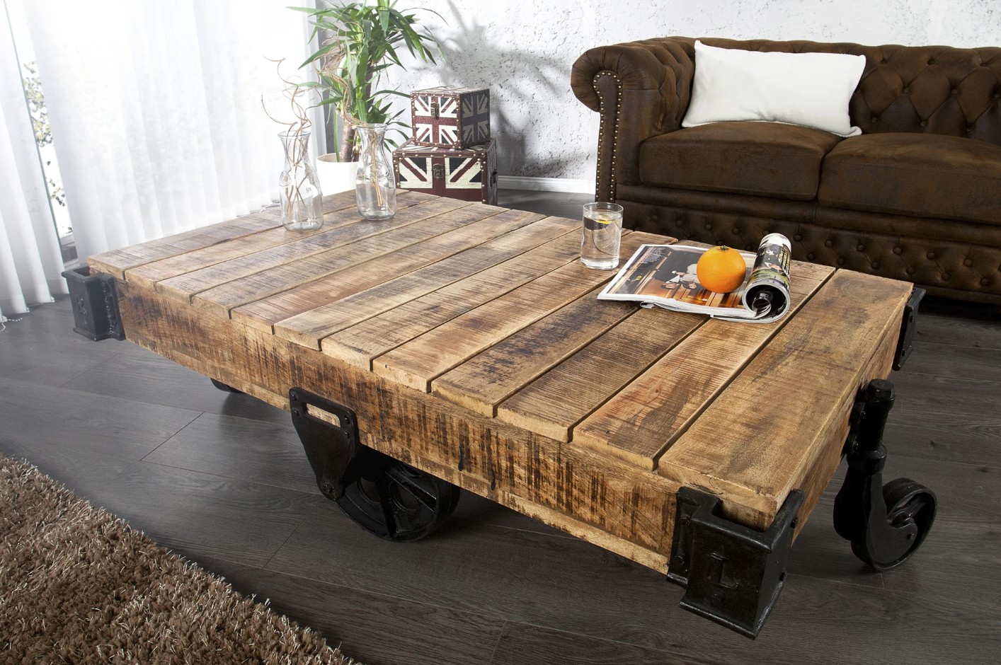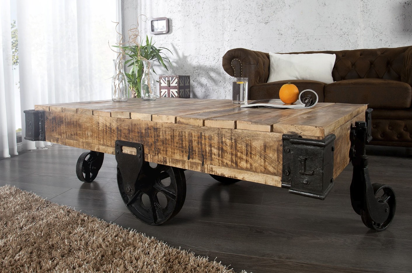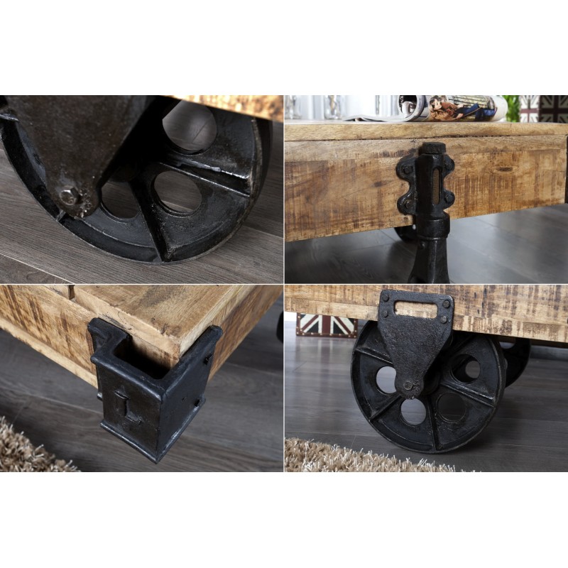 La structure repose sur de véritables roulettes en métal au style industriel, rappelant les chariots d’usine d’autrefois. Ces éléments apportent non seulement du caractère, mais aussi une touche d’originalité forte qui attire immédiatement le regard.