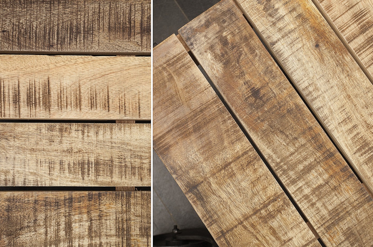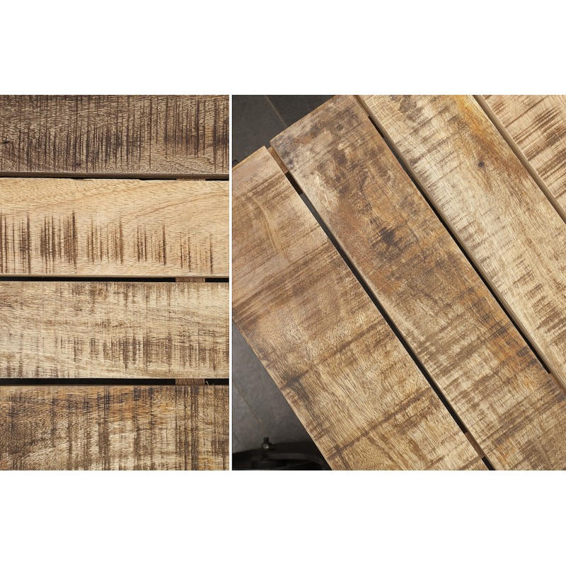 Son plateau épais est composé de planches de bois de manguier verni, soigneusement assemblées. Les nuances naturelles du bois, les irrégularités et les marques visibles apportent une authenticité remarquable, faisant de chaque pièce un modèle unique.