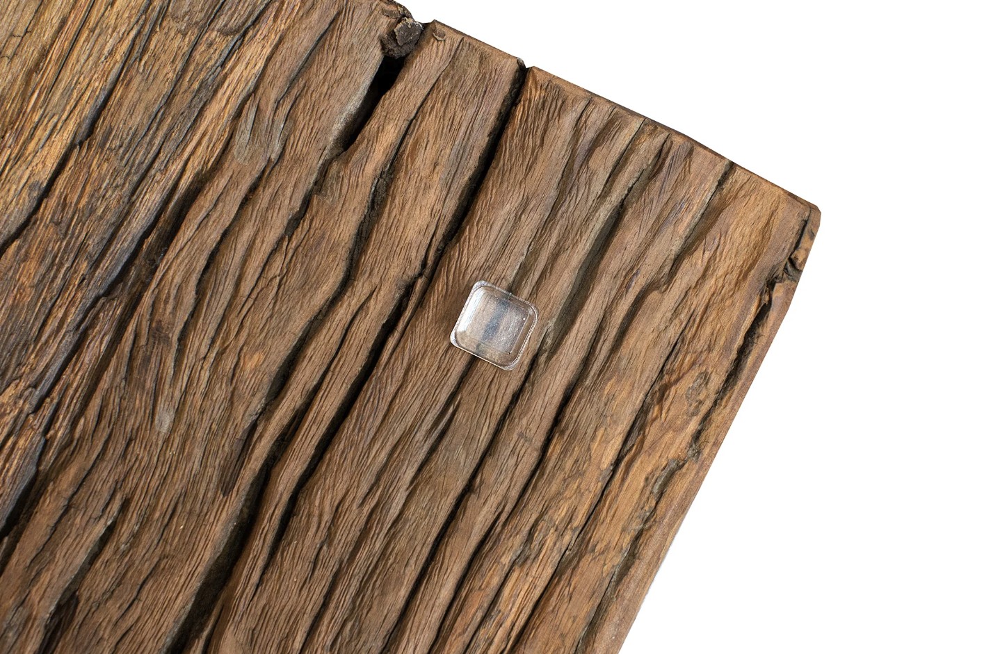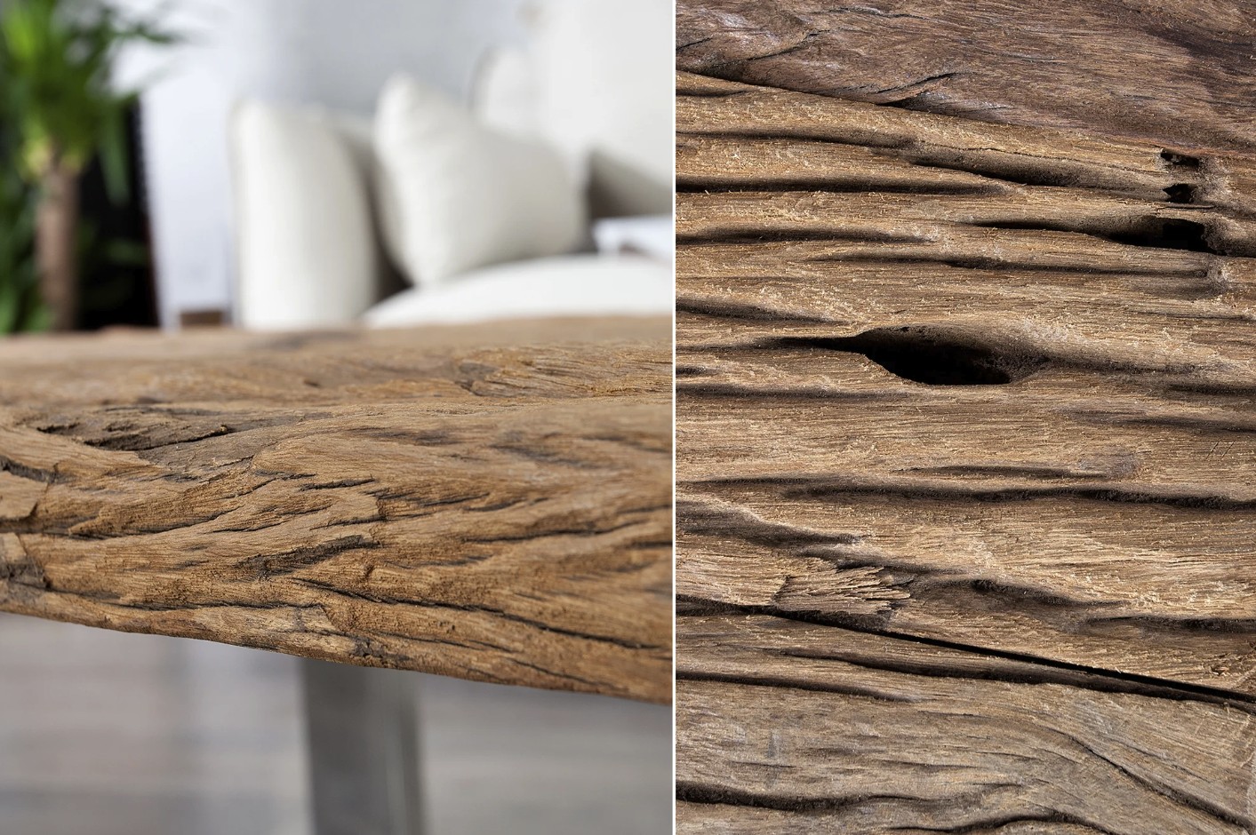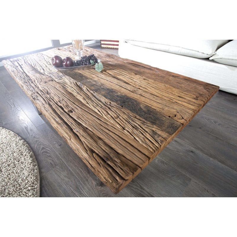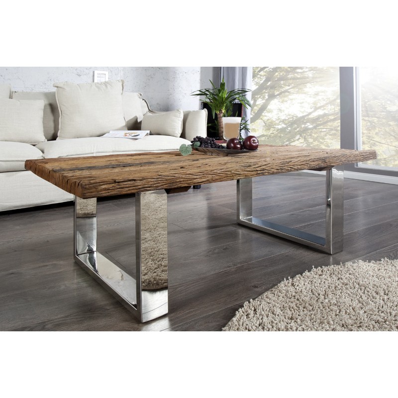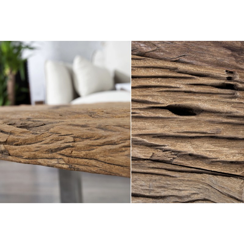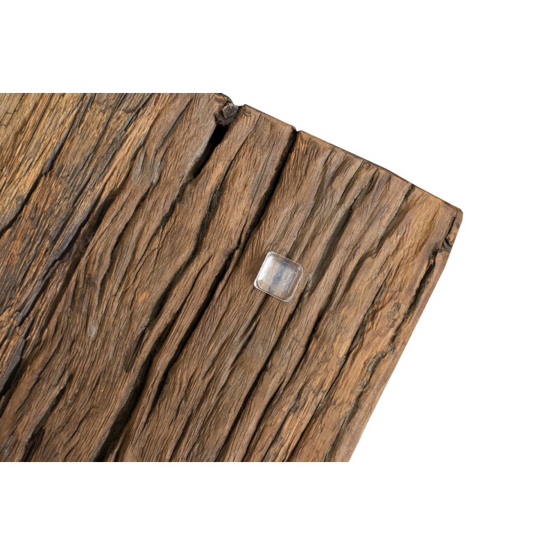 Le plateau en teck recyclé verni révèle toute la richesse du bois : veines apparentes, aspérités, nuances de couleurs et irrégularités naturelles. Son aspect légèrement ondulé et texturé renforce son charme brut et donne à cette table une présence unique dans votre salon.