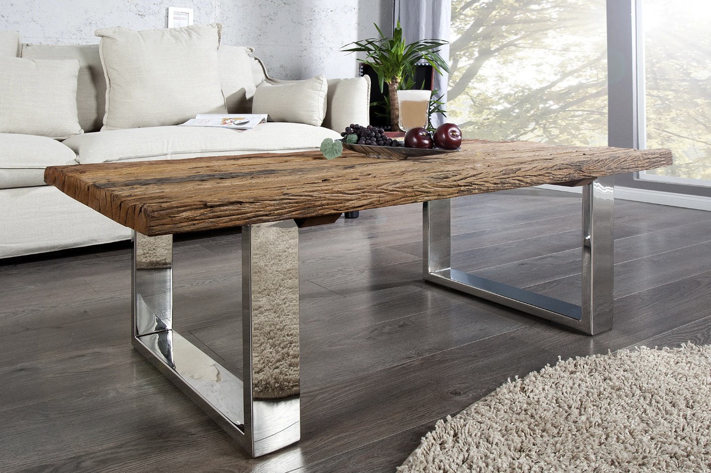 Affirmez le style de votre intérieur avec la table basse RAFTA, une pièce au design industriel marqué qui met à l’honneur la matière brute. Son plateau en bois de teck recyclé attire immédiatement le regard par son aspect naturel, irrégulier et profondément authentique.